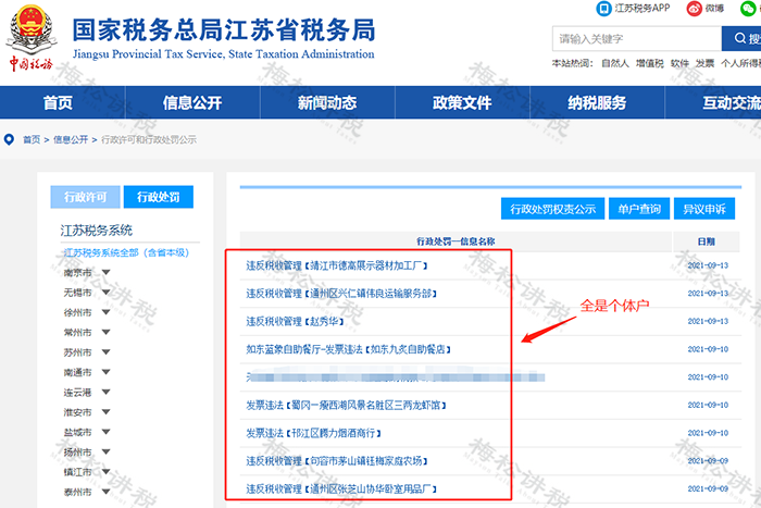 注意了,任何的税收筹划都必须建立在合法的基础上,个体户、个独企业不是法外之地!江苏省税务局近期发布的税务处罚中,大部分被处罚的主体都是个体户!