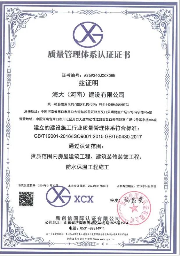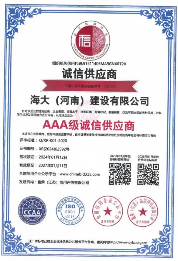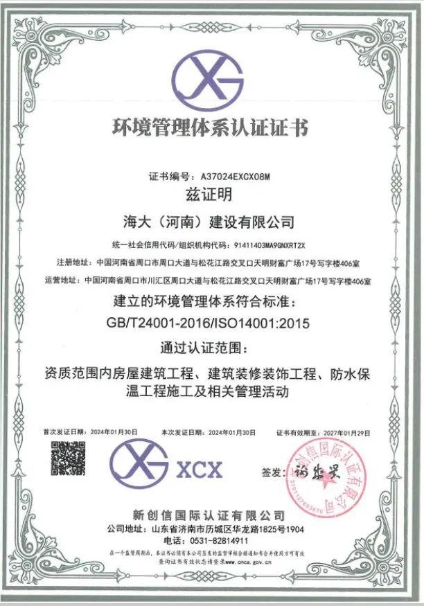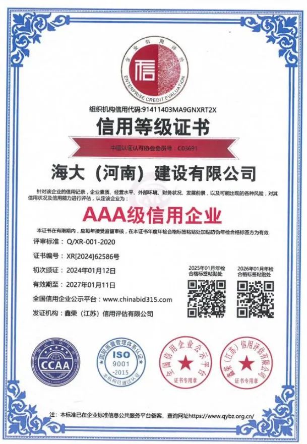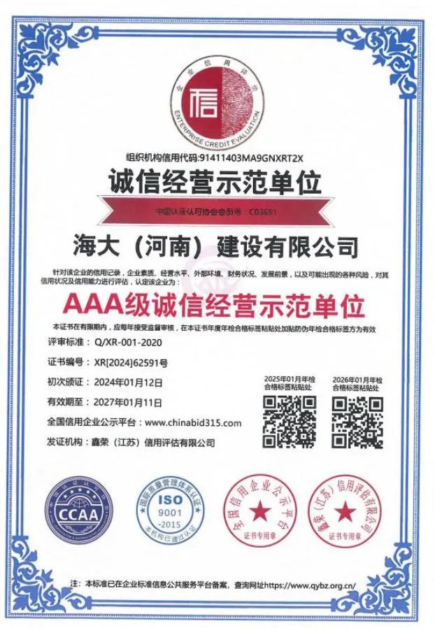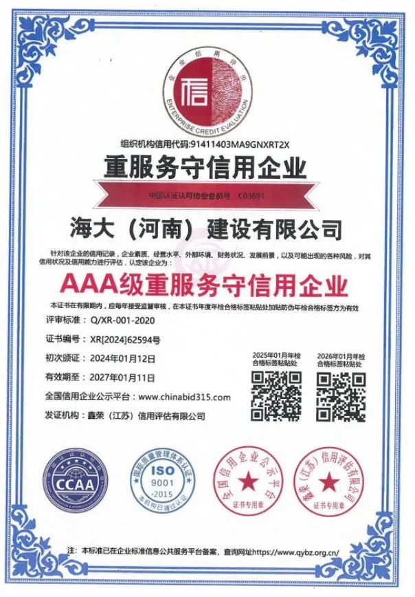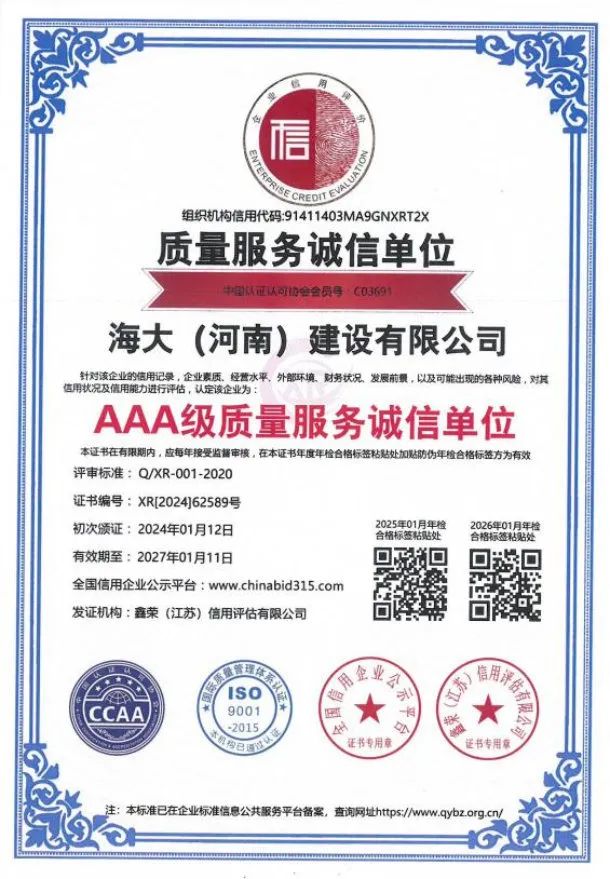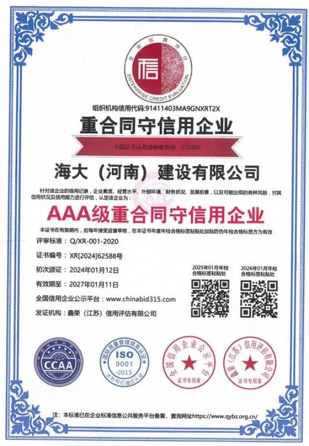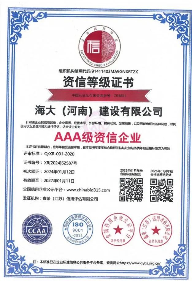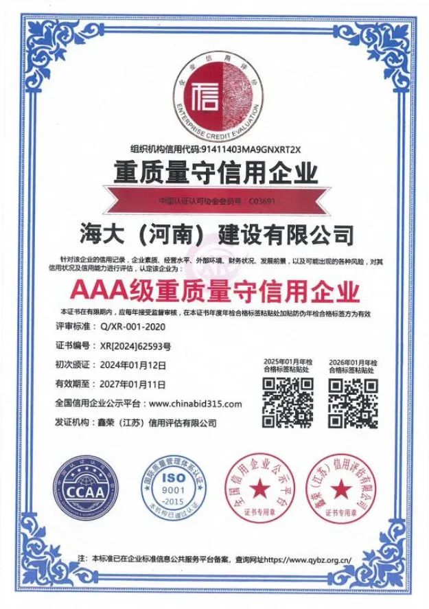 海大(河南)建设有限公司注册资金5288万元,现拥有职工249人,工程技术人员 56人,注册一级建造师12人,注册二级建造师29人,自有技术工人152人,持证上岗率达到100%。同年还通过了 ISO45001 职业健康安全管理体系认证,ISO14001 环境体系认证,ISO9001 质量管理体系认证。