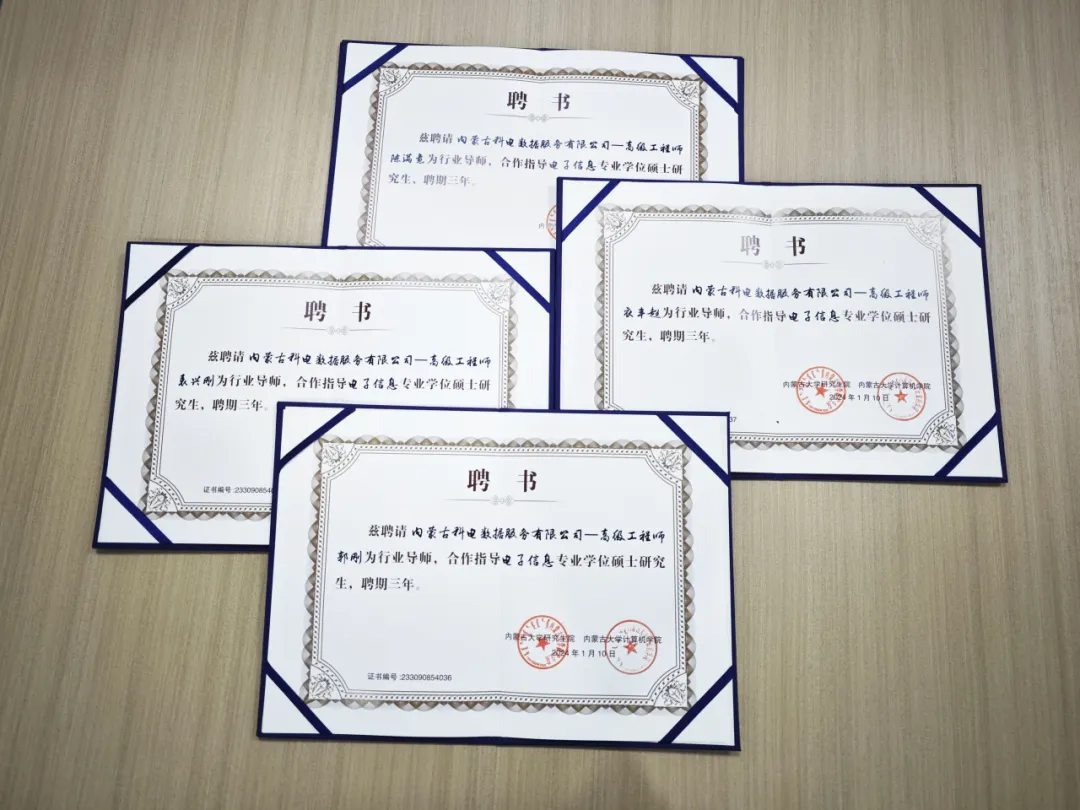 2024年1月,内蒙古科电数据服务有限公司首席技术总监陈满意、专家委员会主任衣丰超、商务委员会主任袁兴刚、高级工程师郭刚被内蒙古大学计算机学院聘为行业导师,与内蒙古大学计算机学院共同合作指导电子信息专业硕士研究生,聘期三年,并于近期参与了内蒙古大学计算机学院21级研究生专业实践考核的工作。