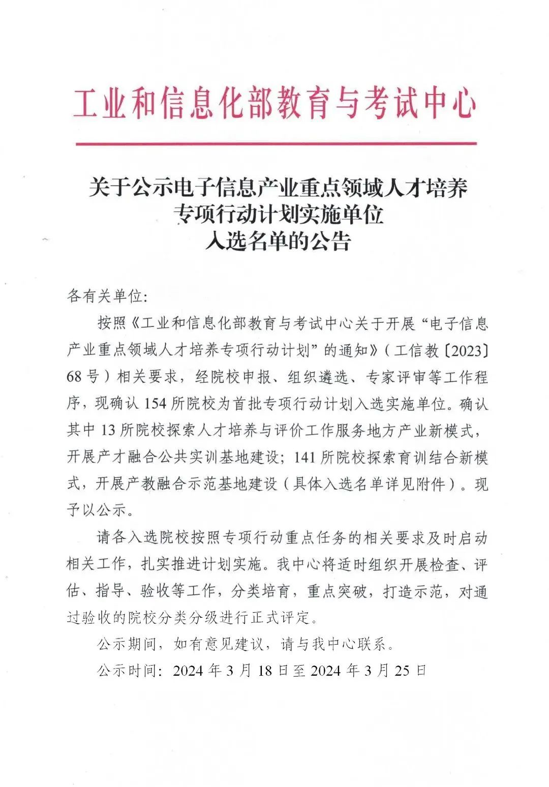 3月19日,工业和信息化部教育与考试中心发布《关于公示电子信息产业重点领域人才培养专项行动计划实施单位入选名单的公告》,经自主申报、组织遴选、专家评审等程序,我院成功入选电子信息产业重点领域人才培养专项行动计划实施单位名单。