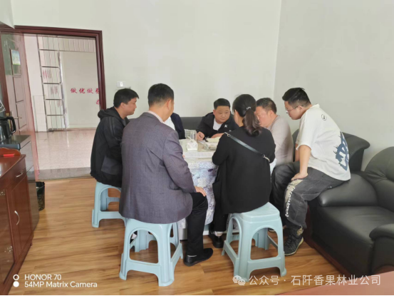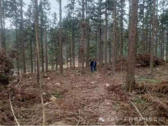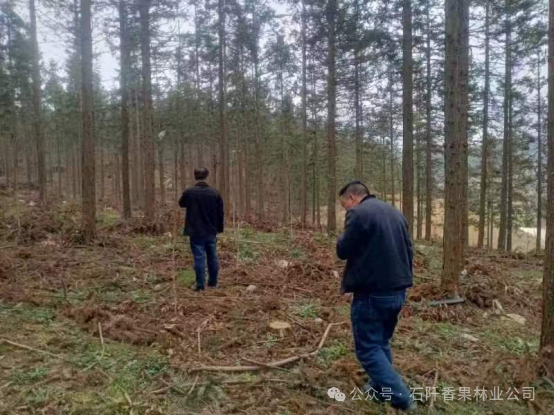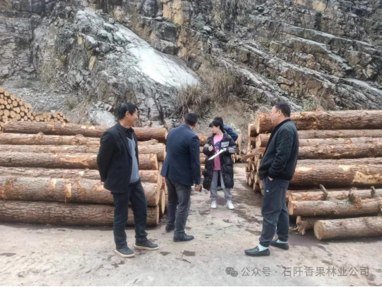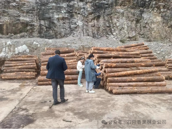 3月18日 公司副总经理郭远松、项目部负责人李晓刚在本庄镇对采伐木材进行检尺。