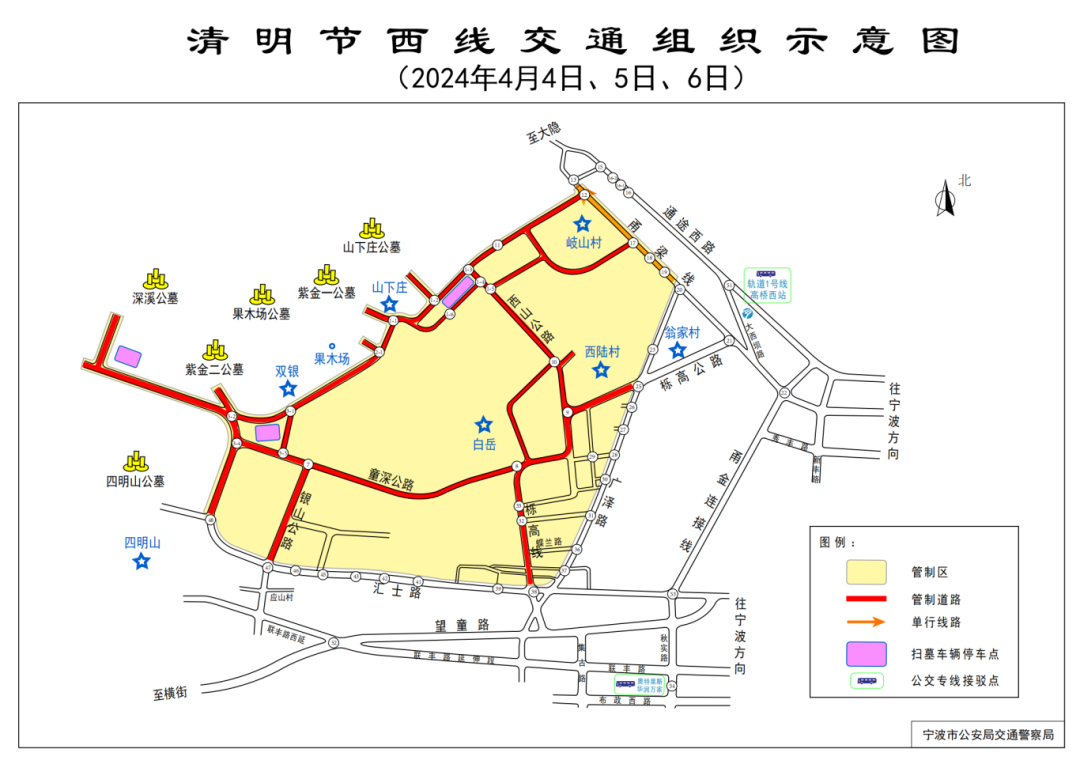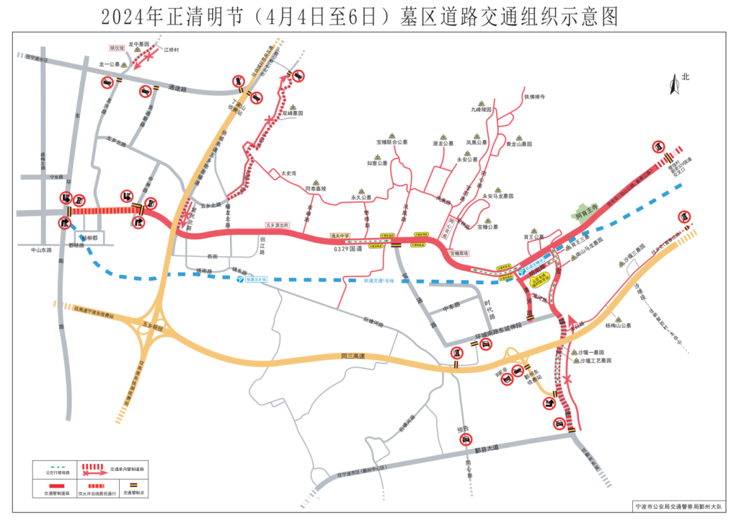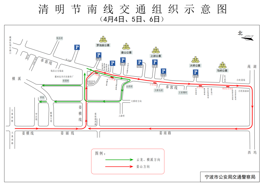 ●往鄞江芝山方向扫墓的机动车实行单向通行,一律沿荷梁线、芝山村、横鄞线(大桥村)方向行驶,车辆停放到附近临时停车场。禁止中型货车、重型货车在横鄞线、荷梁线、芝山村道路通行。