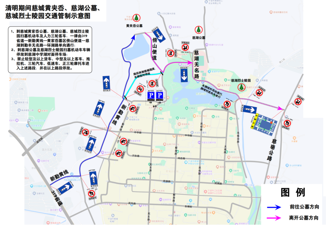 ●往江北黄夹岙公墓的机动车,一律从319省道甬余线、新勤黄线进入黄夹岙,再经黄夹岙公墓傍山便道、慈湖村至勤丰村村道、环湖路、东城沿路、骆慈公路驶出,实行单向交通(除环湖路外)。禁止轻型及以上货车、中型及以上客车、拖拉机、三轮汽车、低速车、正三轮摩托车通行。
