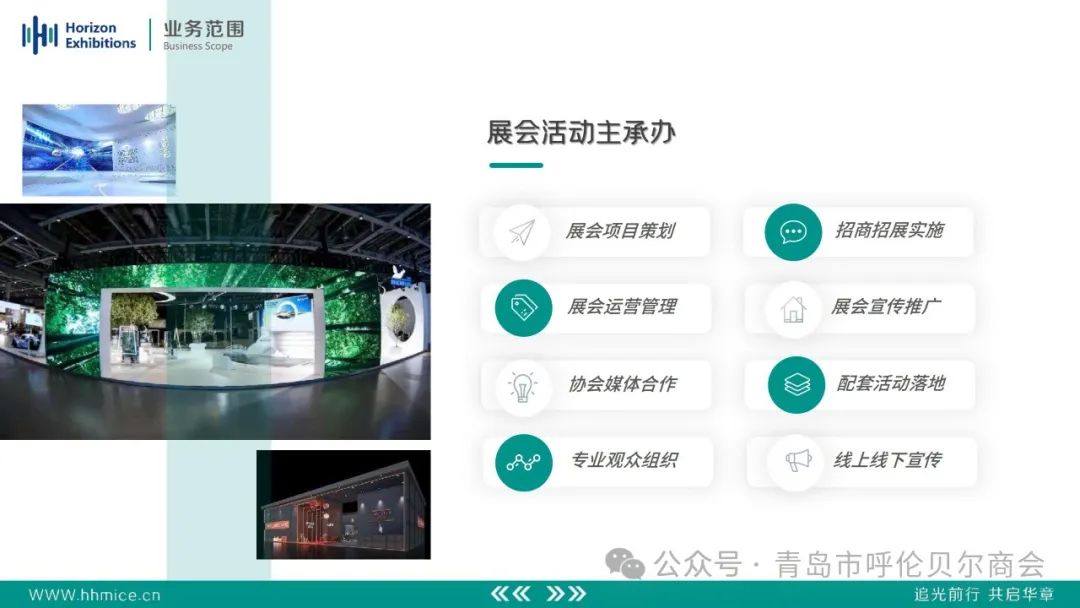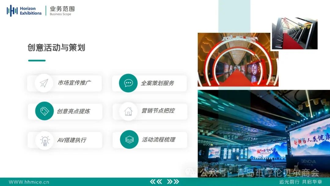 管理、活动创意与策划、项目咨询与调研、展会活动主承办、展馆空间设计、团建拓展体验、线上营销推广、会务系统研发、会展大数据管理等。