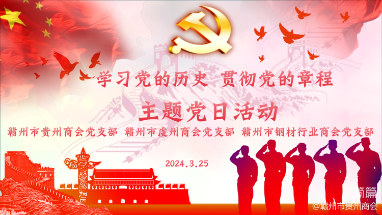 为了进一步弘扬伟大建党精神,传承红色基因,赓续红色血脉,贯彻落实中共赣州市非公经济组织党委2024年工作安排部署。2024年3月25日下午,赣州市贵州商会党支部、赣州市虔州商会党支部、赣州市钢材行业商会党支部联合开展“学习党的历史贯彻党的章程”主题党日活动。