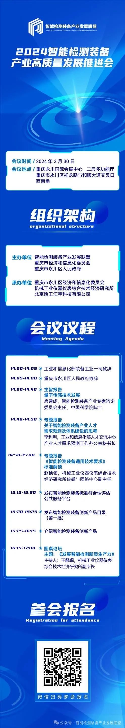 为贯彻发展新质生产力、推进新型工业化的总体要求,落实《智能检测装备产业发展行动计划(2023—2025年)》(工信部联通装〔2023〕19号),智能检测装备产业发展联盟定于2024年3月30日在重庆市永川区举办2024年智能检测装备产业高质量发展推进会,欢迎社会各界报名参会。