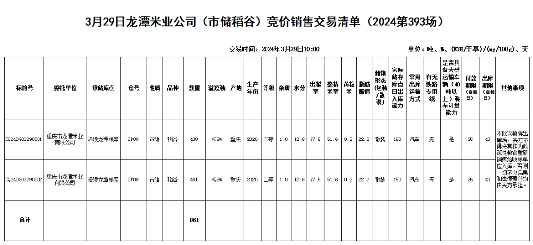 受重庆市龙潭米业有限公司委托,重庆市粮油批发市场有限责任公司(即国家粮食重庆交易中心,以下简称“批发市场公司”)定于2024年3月29日10:00举办龙潭米业公司(市储稻谷)竞价销售交易会,现将有关事项公告如下: