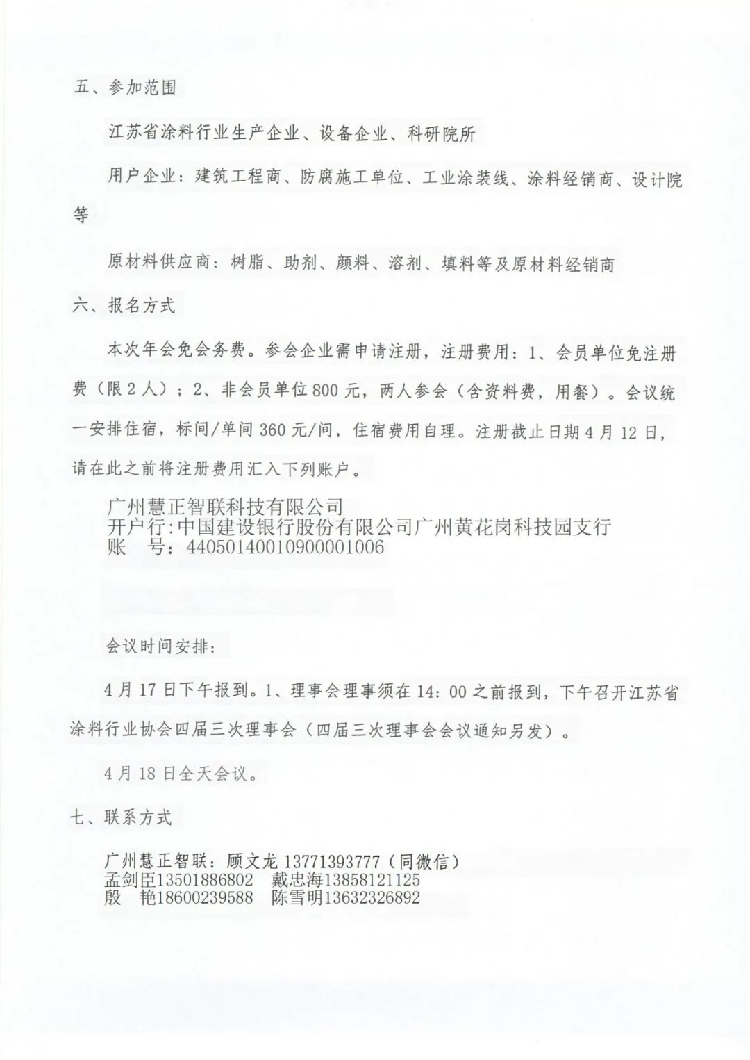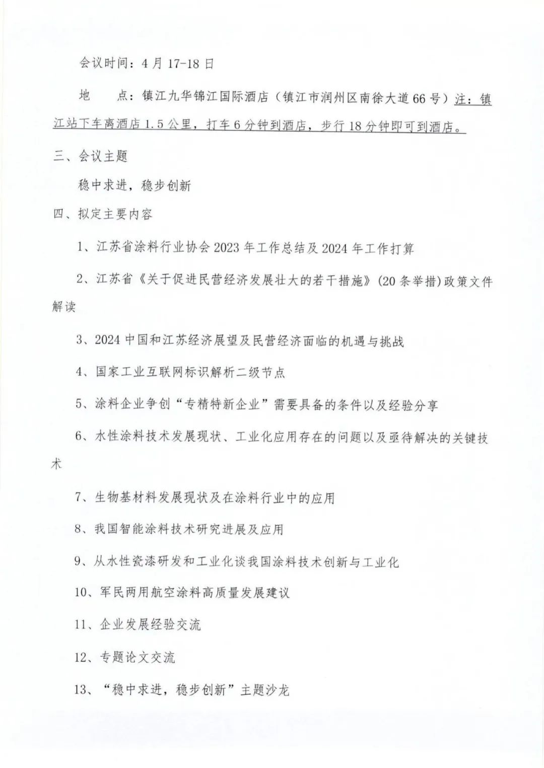 重要提示:1、理事会理事须在14:00之前报到,下午召开江苏省涂料行业协会四届三次理事会(四届三次理事会会议通知另发)。