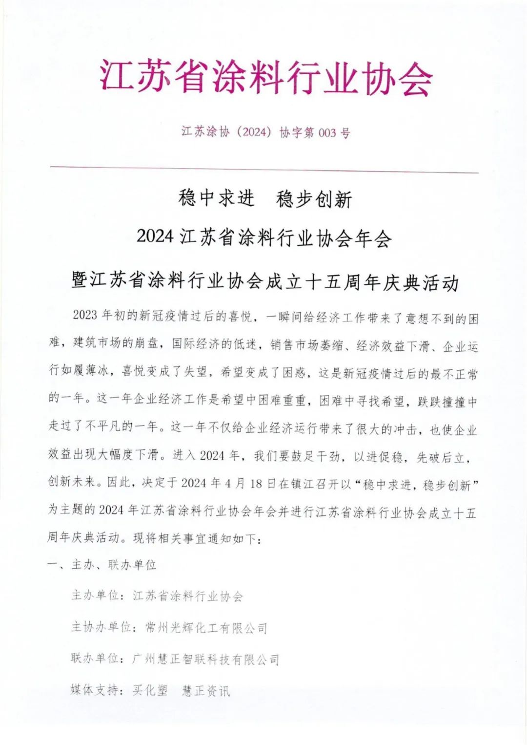 2023年初的新冠疫情过后的喜悦,一瞬间给经济工作带来了意想不到的困难,建筑市场的崩盘,国际经济的低迷,销售市场萎缩、经济效益下滑、企业运行如履薄冰,喜悦变成了失望,希望变成了困惑,这是新冠疫情过后的最不正常的一年。这一年企业经济工作是希望中困难重重,困难中寻找希望,跌跌撞撞中走过了不平凡的一年。这一年不仅给企业经济运行带来了很大的冲击,也使企业效益出现大幅度下滑。进入2024年,我们要鼓足干劲,以进促稳,先破后立,创新未来。因此,决定于2024年4月18日在镇江召开以“稳中求进,稳步创新”为主题的2024年江苏省涂料行业协会年会并进行江苏省涂料行业协会成立十五周年庆典活动。