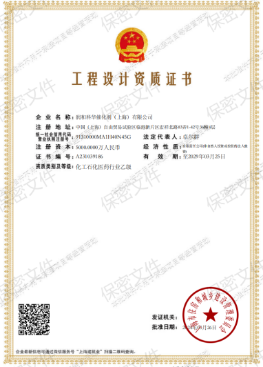 2024年3月25日,上海住房和城乡建设管理委员会,为润和科华(上海)有限公司颁发了化工石化医药行业乙级“工程设计资质证书”。