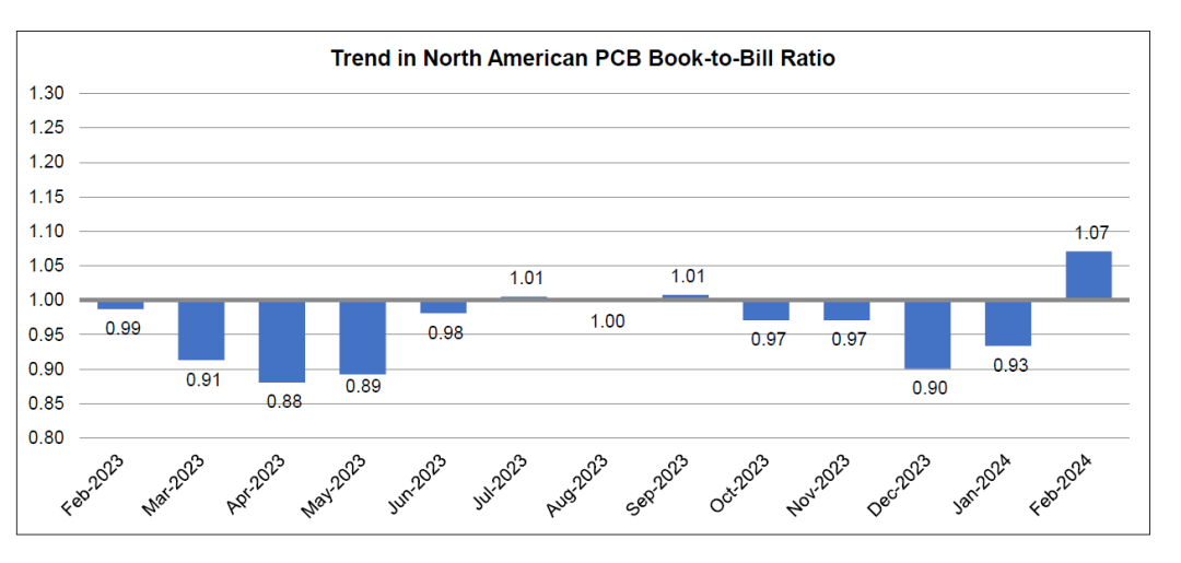 IPC首席经济学家Shawn DuBravac表示:“2月份订单强劲,PCB订单出货量自2023年9月以来首次超过1。在目前的市场环境下,这可能不是当前市场环境的永久性转变,但它将在未来几个月保持订单出货比的上升。”