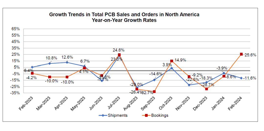 2月份PCB订单与去年同期相比增长了25.6%。二月份的预订量比上月增长了47.5%。