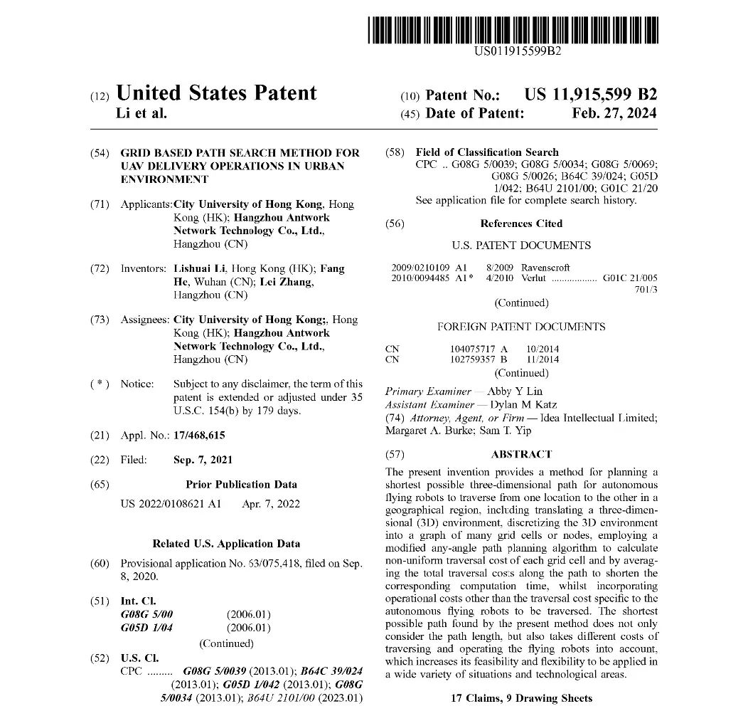 该技术面向的领域广泛,不仅限于无人机配送,还包括其他需要高度自动化和精确航线规划的应用,如军事侦察、监视、安全、搜索与救援、精密农业、无线通信技术、货物运输、导航和电影制作等。通过为无人机航线规划提供一种结合安全性、效率和成本效益的方法,这项技术能够优化城市空间中的物流和运输任务,从而为为低空高效稳定的运营提供了良好的条件。迅蚁(www.antwork.link)是一家致力于构建城市空中配送网络的科技公司。设计开发的物流无人机、无人站及云端UTM和调度系统能够无缝协同运行,为城市提供安全快速的自动化航空货运服务。/ 宇泛“杭州OPPO全球移动终端研发总部大楼精细化管控项目”荣耀上榜「2023年度中国物联网行业标杆案例榜」/ 宇泛“多模态三维人脸防伪识别设备关键技术研究及应用”项目荣获浙江省科学技术进步奖三等奖/ 成功入选杭州市金融办更新了《杭州市重点拟上市企业名单》作为国家专精特新“小巨人”企业和浙江省科技小巨人企业,宇泛一直注重技术创新、产品创新和产业化落地,并承担了国家重点研发计划项目。宇泛拥有浙江省企业研究院,以人工智能和智能物联两大数字化技术为核心驱动力,同时以AIoT中台作为组织引擎,有效实现产业链上下游软硬件生态合作伙伴的汇聚,共同构建面向智慧城市供给侧改革的新赋能模式。一直以来,宇泛都持续秉承“小场景、真智慧”的理念,深挖场景痛点,并以数据要素为核心生产要素,实现更智能的“降本增效”。