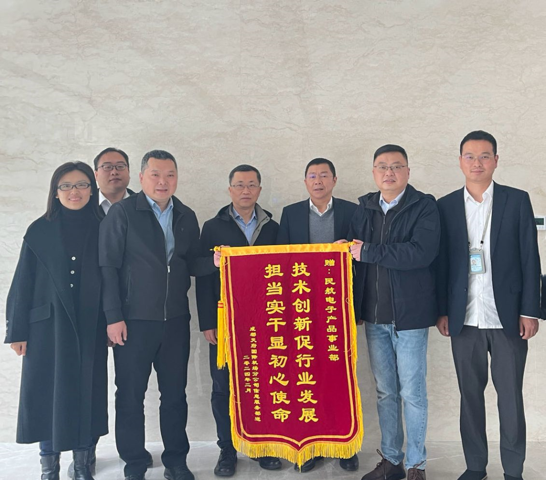 2024年3月12日,成都天府国际机场分公司信息服务部向民航二所电子公司产品事业部送来一面书写着“技术创新促行业发展、担当实干显初心使命”的锦旗,天府机场分公司副总经理杨建伟、信息服务部经理方冉,电子公司副总裁程华、产品事业部总经理李静毅及天府项目组全体成员参加了赠旗仪式。杨建伟高度肯定了电子公司产品事业部在地空一体证件查验系统项目建设过程中所展现出的专业、高效与敬业,以及在技术创新领域的卓越表现。