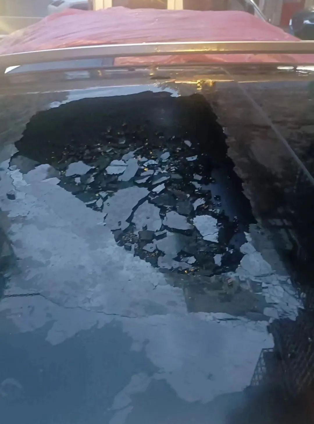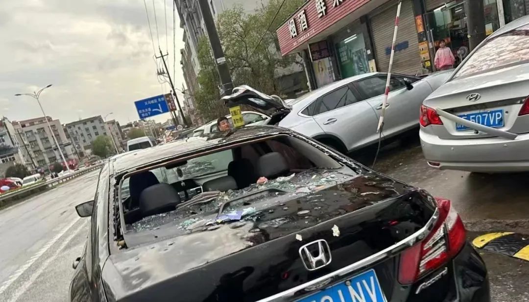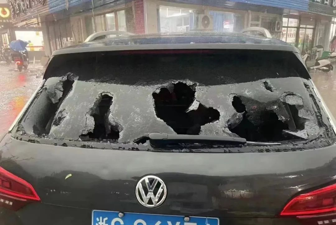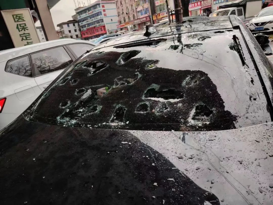 还有不少车子因此受损,车前盖砸出一块块凹凸不平,车窗被砸稀烂。昨日的保险电话被打爆,今天一大早4S店也停满了需要维修的车子。