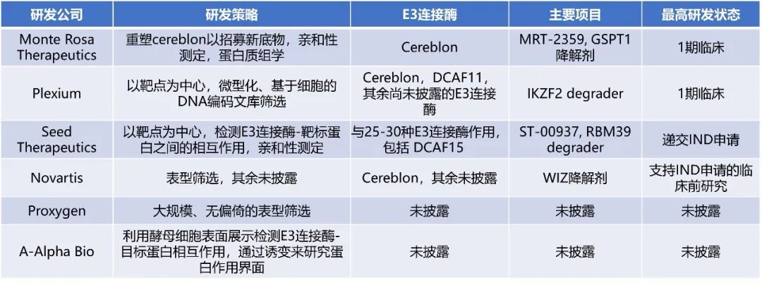 分子胶是一类单价小分子(<500 Da),能够改变E3连接酶的表面结构,从而促进新的蛋白质-蛋白质相互作用。与蛋白降解嵌合体(PROTAC)相比,分子胶因其较小的分子量而更易于细胞吸收,并且可以在较低剂量下发挥作用。不同于靶向PROTAC采用灵活连接子(linker)连接两个配体、并允许它们扭曲和转动以形成接触点的方式,分子胶降解剂通过更直接地介入蛋白质界面,加强E3连接酶与靶蛋白之间的复合物形成,从而诱导它们之间的亲和力增加,最终导致靶蛋白的泛素化与降解。目前最广为人知的分子胶降解剂是沙利度胺(thalidomide)及其类似物泊马度胺(pomalidomide)等获批的免疫调节药物(IMiD),它们能与CRL4CRBN E3泛素连接酶中的底物受体蛋白cereblon(CRBN)相结合,通过改变CRBN所靶向底物蛋白的特性,使得CRL4CRBN E3泛素连接酶得以与新的底物蛋白相连并诱导该蛋白后续的降解。▲分子胶作用原理图示(图片你来源:参考资料[1])然而,开发创新的分子胶降解剂面临着不少挑战。首先,分子胶降解剂的初步筛选必须在细胞环境中完成,这不仅提高了成本、增加了时间消耗,还需要大量的后期验证工作。人体内存在600多种E3连接酶,从中挑选出适合降解特定目标蛋白的连接酶颇具挑战性,尤其是考虑到科学家对这些连接酶中的仅20-30种有较深入的生物学理解,这为发现新的分子胶增加了难度。此外,找到能够促使E3连接酶与目标蛋白互动的小分子的几率较低,并且目前对分子胶的一般化学特性的了解尚浅,这些因素均提高了化合物库筛选的复杂性,通常需要依赖大型的化合物库才有可能找到合适分子。尽管分子胶类药物的开发过程不易,仍有不少公司勇敢地接受了这一挑战,通过不同研发策略来开发潜在的分子胶药物,尤其是针对难以成药的蛋白,像是转录因子这样缺乏可供小分子药物结合口袋结构的蛋白。这些专注于分子胶疗法开发的公司及其策略主要包含:▲专注于分子胶疗法研发的部分公司名单(图片来源:药明康德内容团队根据参考资料[1]制表)Monte Rosa Therapeutics专注开发利用cereblon E3连接酶降解特定靶标蛋白的分子胶疗法。该公司的联合创始人Raj Chopra先生在Celgene公司工作期间,曾带领团队成功鉴定了首批cereblon降解底物,并展现了通过合理方法发现其新底物的巨大潜力。Monte Rosa公司的核心理念是通过使用不同的分子胶来改变cereblon的表面结构,从而招募并降解多种蛋白质。这些cereblon底物蛋白中,大部分是带有被称作“G环”的降解结构的锌指转录因子。Monte Rosa利用人工智能工具来预测不同小分子如何重新塑造cereblon的表面,使其能够招募并降解含G环的转录因子及其他蛋白质。基于已知的cereblon-分子胶复合体晶体结构,公司合成了这类分子,并在蛋白质和细胞层面进行筛选,通过生化和细胞亲和性测定来鉴定被降解的蛋白质,以验证蛋白间的相互作用,并利用蛋白质组学技术来验证降解事件并确保其特异性。Monte Rosa的首席战略官Owen Wallace博士透露,通过筛选,Monte Rosa已经鉴定出与cereblon结合的新靶点,这些靶点的结合方式与预期不同。公司目前正在研究的两个项目分别针对cdk2和Vav1,这两个靶点都不包含传统的G环结构。这一发现表明,通过引导cereblon识别非传统靶点的方法是可行的,并且其潜在的靶标空间仍在不断扩展。Proxygen公司开发了一种功能强大的专有技术平台,专注于大规模识别针对难治性或传统手段难以作用的靶点的分子胶降解剂。Proxygen高度通用、专有的发现引擎,支持针对难以成药或不可成药靶点的分子胶降解剂的大规模特异性和无偏倚的筛选。公司的首席执行官Bernd Boidol博士表示,仅依赖结构方法无法揭示所有的作用机制,因此公司旨在深入了解分子胶降解剂和E3连接酶之间的生物学机理,以推动该领域的发展。同时,Proxygen通过结合精准的靶点选择和临床验证来平衡技术与生物学风险。
