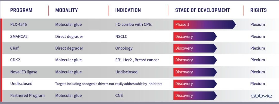Seed Therapeutic强调在分子胶药物开发中选择恰当的E3连接酶的重要性。公司的研发流程从评估靶蛋白与E3连接酶之间的互补性开始,利用AlphaFold等计算技术,并考虑E3连接酶在细胞内的位置;然后在细胞模型中研究E3连接酶与靶蛋白的相互作用;验证E3连接酶对靶蛋白的泛素化能力;随后通过高通量筛选来发现合适的降解剂,并进行验证;最终通过药物化学研究来提高药物的效能、特异性和稳定性。Seed Therapeutics的总裁及首席科学官James Tonra博士指出,选择一个能够经受包括高通量筛选和基于细胞的活性测试等所有检验的E3连接酶,是避免在长期研发结束后因需更换E3连接酶而重复研究的关键。A-Alpha Bio是一家运用合成生物学和机器学习技术来测量、预测和设计蛋白质之间相互作用的生物技术公司。该公司拥有两个核心技术平台:AlphaSeq能够快速且定量地测量数百万种蛋白质间的结合亲和力;而AlphaBind则是一个计算平台,它使用全球最大型之一的蛋白质相互作用数据库进行训练,能够基于序列预测蛋白质结合强度。A-Alpha Bio公司采用了一种高通量酵母细胞表面展示系统来测试蛋白之间的相互作用。通过将目标蛋白与酵母的锚定蛋白以及参与蛋白质分泌的信号肽序列融合,工程化改造后的酵母细胞能够在其表面表达各种细胞内部蛋白。这些酵母细胞在液体培养中混合并振荡,通过蛋白-蛋白相互作用引导的细胞融合来筛选相互作用的蛋白对。随后对产生的二倍体细胞进行测序,以确定参与相互作用的蛋白质,并通过生物物理验证实验进一步确认。接着,公司会对蛋白-蛋白界面进行突变实验,以探究增强这些相互作用的可能性。A-Alpha Bio的最终目标是通过优先识别和改进现有的蛋白质相互作用,来增加发现有效分子胶的成功率。Plexium是一家新一代靶向蛋白降解(TPD)疗法研发公司,致力于开发单价直接降解剂和分子胶,针对治疗癌症中难以攻克的靶点。公司专有的药物发现平台旨在发现新型小分子药物,通过E3连接酶介导的蛋白酶体降解途径,诱导致病蛋白的选择性降解。Plexium的平台将“on-bead”DNA编码文库(DEL)筛选技术与超高通量微型化细胞检测相结合,能够在与疾病相关的细胞环境中直接测量一个或多个目标蛋白的降解情况。Plexium正在利用其平台来鉴定针对致病蛋白的单价降解剂或分子胶降解剂。Plexium旗下多款分子胶研发项目正在积极推进,其中PLX-4545已进入临床开发阶段。▲Plexium公司研发管线(图片来源:Plexium公司官网)诺华公司也在分子胶领域有所布局,专注于开发针对转录因子WIZ的分子胶降解剂。在美国血液学会年会上,该公司报告了两种新型降解剂dWIZ-1和dWIZ-2的研发成果。dWIZ-1是通过针对CRBN的化学库进行表型筛选获得的,筛选标准是寻找能促进胎儿血红蛋白(HbF)表达而不影响红系细胞增殖和分化的化合物。后续的蛋白质组学分析确认了WIZ为其靶点。诺华的dWIZ-2是基于dWIZ-1优化后的分子,因其优良的药物动力学属性而适用于体内WIZ降解和HbF诱导的评估。在体外实验中,dWIZ-2显著增加了镰状细胞病患者来源的红系细胞的HbF表达。利用人源化小鼠模型对dWIZ-2的体内效应进行评估时,显示其能剂量依赖性地降解WIZ并提高HbF水平。在动物模型中,连续28天每日口服dWIZ-2治疗后,观察到外周血中γ-珠蛋白mRNA水平和HbF阳性网织红细胞比例显著增加。此外,dWIZ-2具有良好的耐受性,未观察到任何与治疗相关的血液学、凝血或临床化学指标的变化。这些研究成果支持将口服WIZ降解剂作为治疗镰状细胞病的新策略。分子胶疗法的发展被广泛看好,许多大型药企也在这个领域进行布局,并与许多生物科技公司达成合作协议。例如,Proxygen分别在2020年、2022年、2023年与勃林格殷格翰(Boehringer Ingelheim)、德国默克(Merck KGaA)和默沙东(MSD)达成共同开发分子胶降解剂的协议。而Monte Rosa Therapeutics公司则在去年10月与罗氏(Roche)达成合作,将共同针对此前被认为不可成药的癌症和神经疾病靶点共同开发分子胶药物。此外,Orionis Biosciences也在去年9月宣布与罗氏(Roche)旗下基因泰克(Genentech)达成金额高达20亿美元的多年合作,将共同针对重大疾病领域中的挑战性靶点发现新型分子胶药物,包括肿瘤学和神经退行性疾病。今年2月,百时美施贵宝(Bristol Myers Squibb)与VantAI达成战略合作,将共同针对某些治疗靶点发现新的分子胶。此次合作利用VantAI的几何深度学习能力和百时美施贵宝在靶向蛋白质降解方面的专业知识来发现和开发新的小分子疗法。同月,诺和诺德(Novo Nordisk)也与Neomorph达成14.6亿美元的合作,将共同发现、开发和商业化分子胶蛋白降解剂的合作。尽管在这一创新领域还存在许多挑战,包括需要解析复杂的生物学相互作用和实现精确靶向等,但大型药企的大力投资和生物技术公司的持续关注表明,分子胶疗法具有广阔的发展前景。随着研究人员不断在科学研究上取得新的突破,让我们期待在不久的未来会有更多分子胶降解剂进入临床、造福患者。