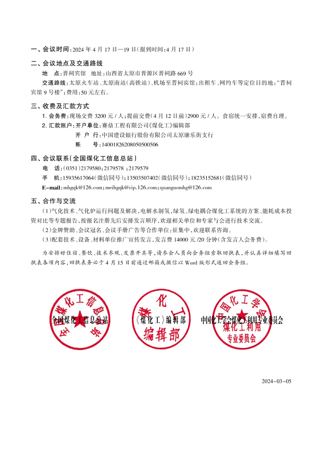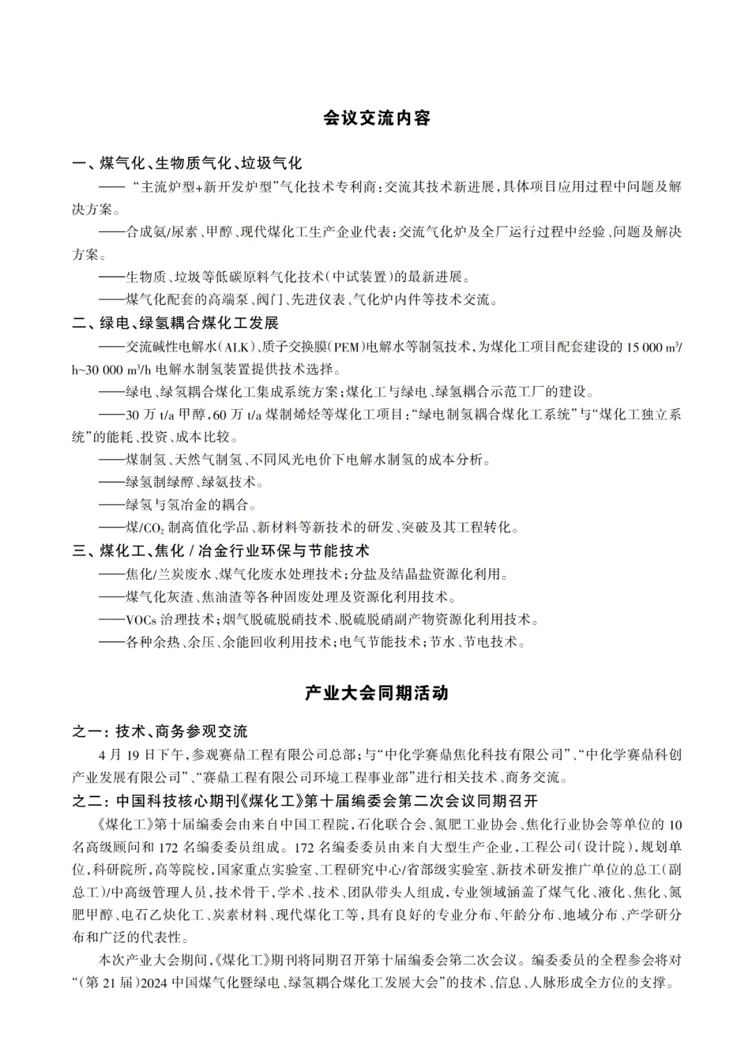 气化技术、气化炉运行问题及解决,电解水制氢,绿氢、绿电耦合煤化工系统的方案、能耗成本投资对比等专题报告,按报名注册先后安排发言顺序,欢迎相关单位和专家与会进行技术交流。