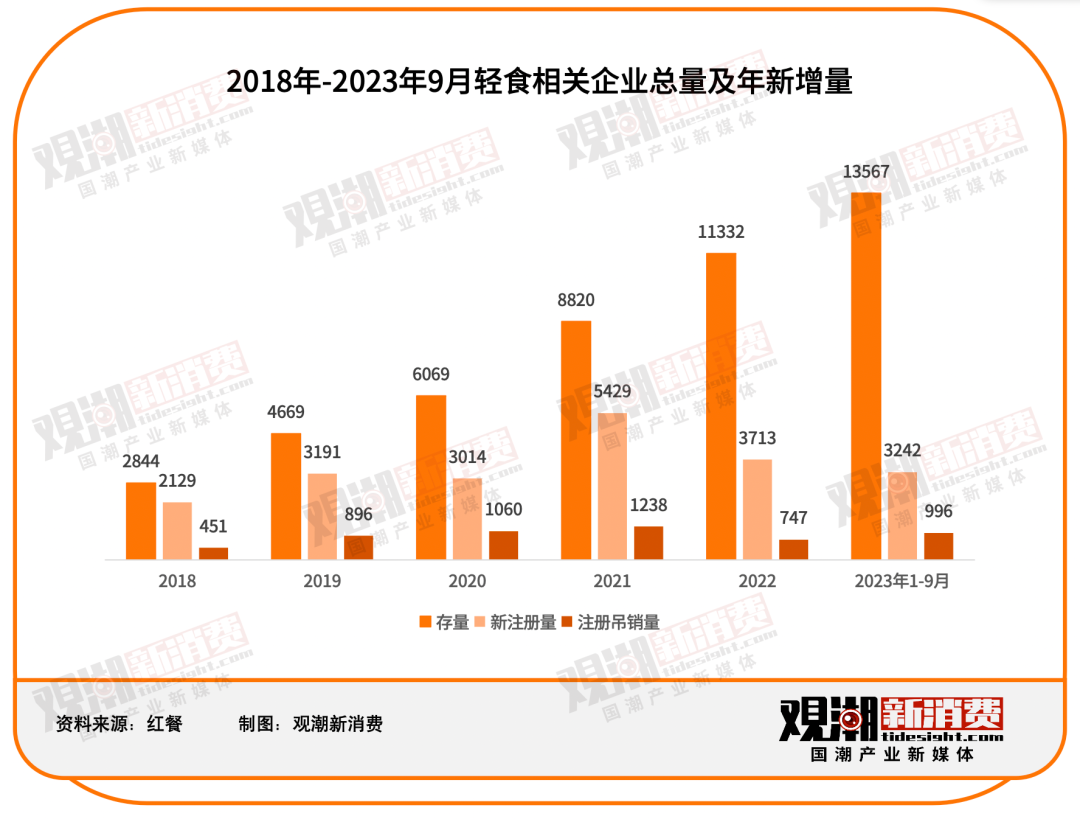 根据美团外卖发布的《轻食消费大数据报告》估算,2022年国内轻食市场规模可突破1000亿元,5年内逐步占到餐饮总收入的10%左右。根据红餐数据,截至2023年9月,我国现存“轻食”相关企业超过1.35万家。