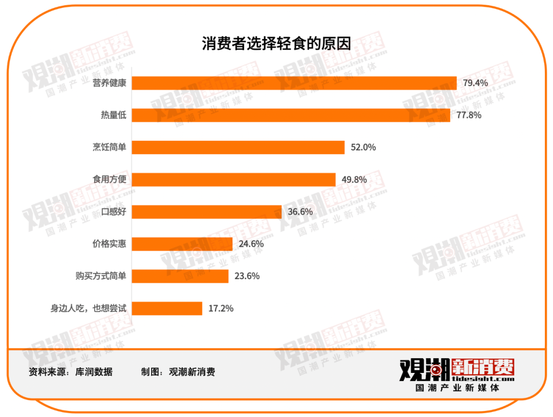 “爱美之心人皆有之”,推动轻食市场快速成长的最大原因莫过于“身材焦虑”的蔓延。针对女性的“直角肩”、“天鹅臂”、“女团腿”,针对男性的“倒三角”、“人鱼线”、“八块腹肌”等等关于身材的修饰词,都在迫使着当代年轻人对身材的要求越发严格,轻食在这样的需求背景下疯狂生长。根据库润数据的调研,选择轻食的消费者有接近八成是因为营养健康和热量低。