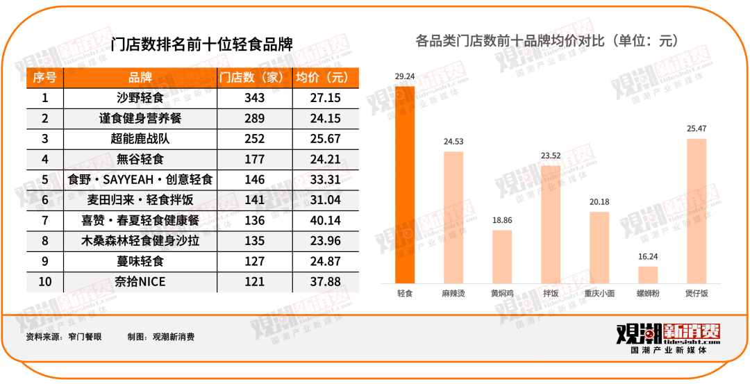 根据窄门餐眼数据,目前市面上门店数量靠前的10个轻食品牌均价约为29.24元,对比麻辣烫、黄焖鸡等打工人常备的快餐,价格高出了一大截,甚至比螺蛳粉贵出将近一倍。