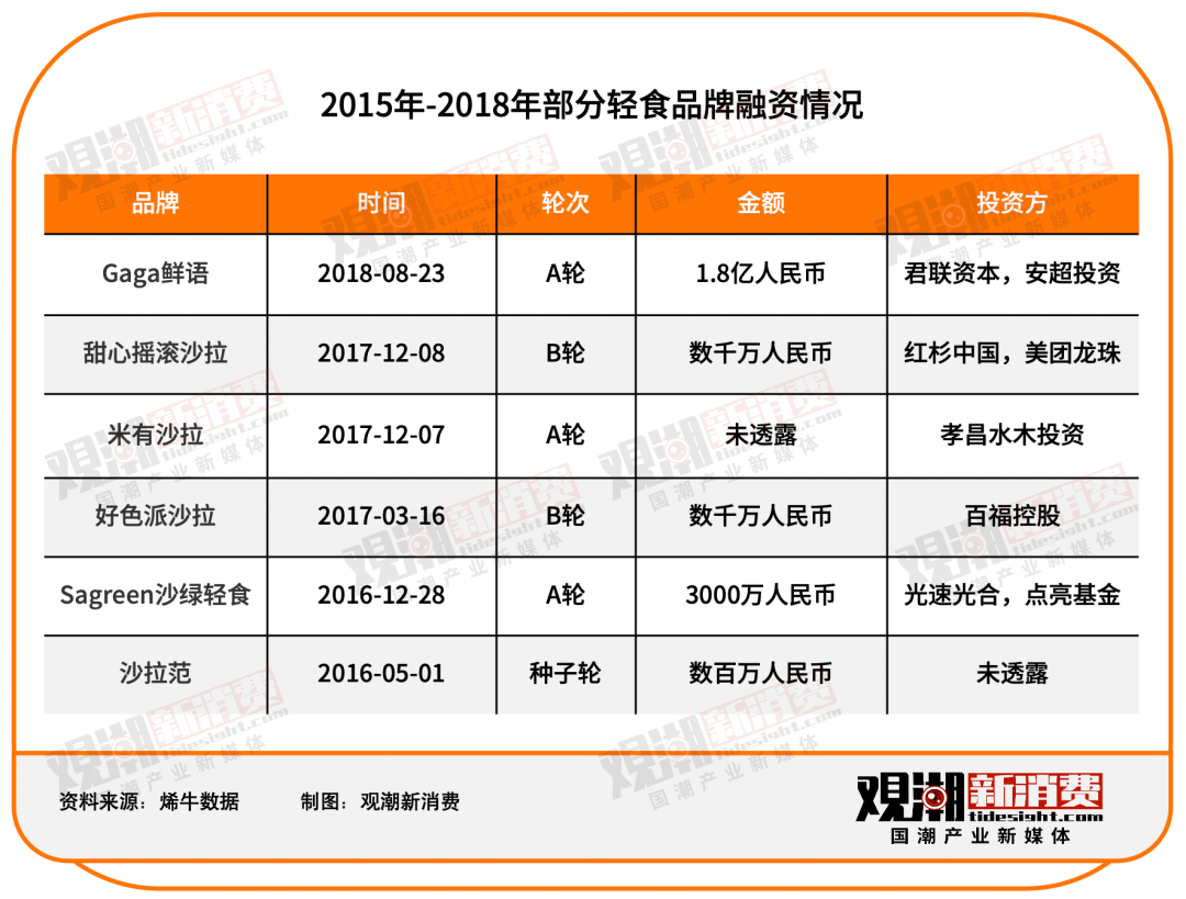 2014年被称为“沙拉元年”。随着健康饮食概念在中国不断推广和普及,轻食行业迎来了大批创业者,在2014年进入爆发阶段。2015至2018年,至少有10亿资本涌入轻食市场,大批轻食品牌获得资本青睐。