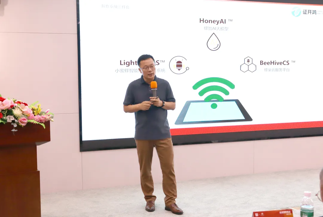 程胜春先生介绍到,证开鸿依托LightBeeOs 操作系统\BeeHiveCS 蜂巢云服务\HoneyAI蜂智AI大模型,构建一个完整的智能生态系统,为用户打造“端、边、云、网、智、用”的全栈服务与解决方案。以“1+N”的战略开展业务,“1”代表深耕金融领域市场,“N"代表广泛赋能其他多个领域市场,包括不限于能源、安平、政务、教育、医疗、交通等行业。展示了多款软件发行版、自研商用设备获颁兼容性测评证书,公司深入研究OpenHarmony操作系统的核心技术,AI 原生智能、分布式架构、多设备链接、场景化路设备协作,在行业安全特性方面获得了一定的技术突破,并申请多项发明专利。震撼发布了5款搭载LightBeeOS(OpenHarmony4.0版本)的多款智能终端设备,包括证开鸿PC、证开鸿工控主机、兼容性测评设备、OpenHarmony开发者套件等。