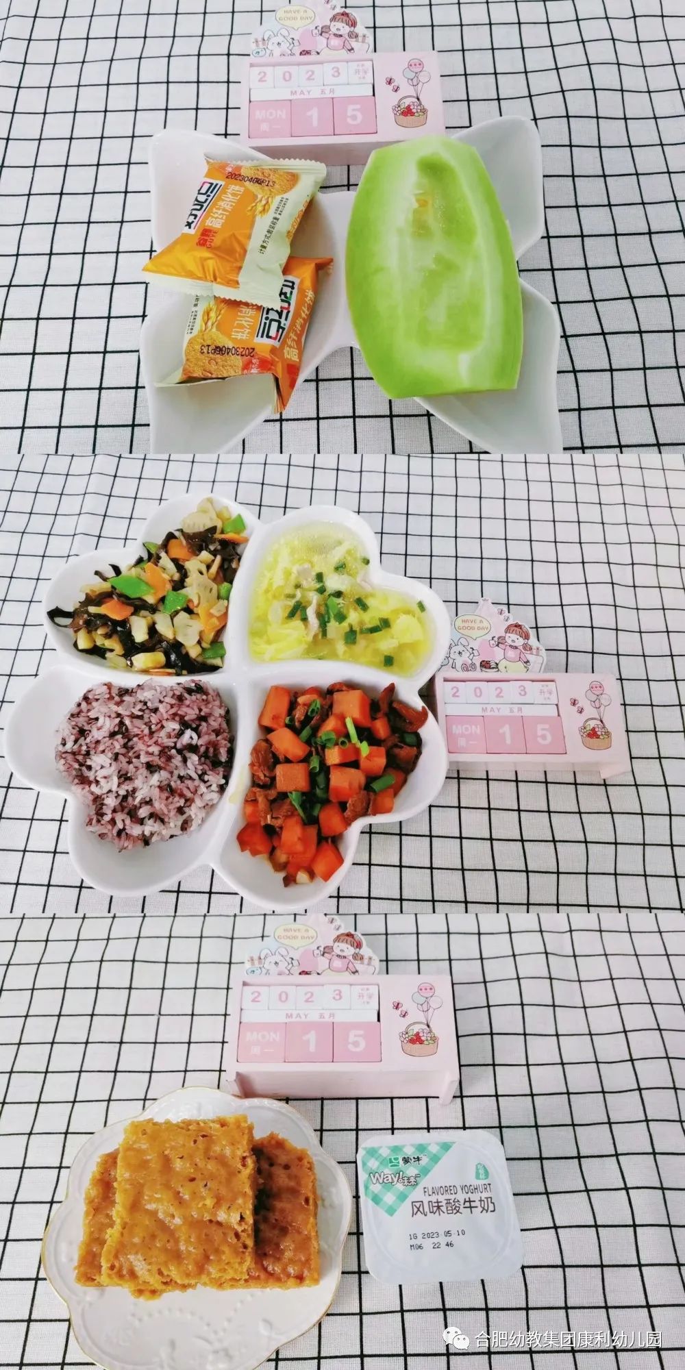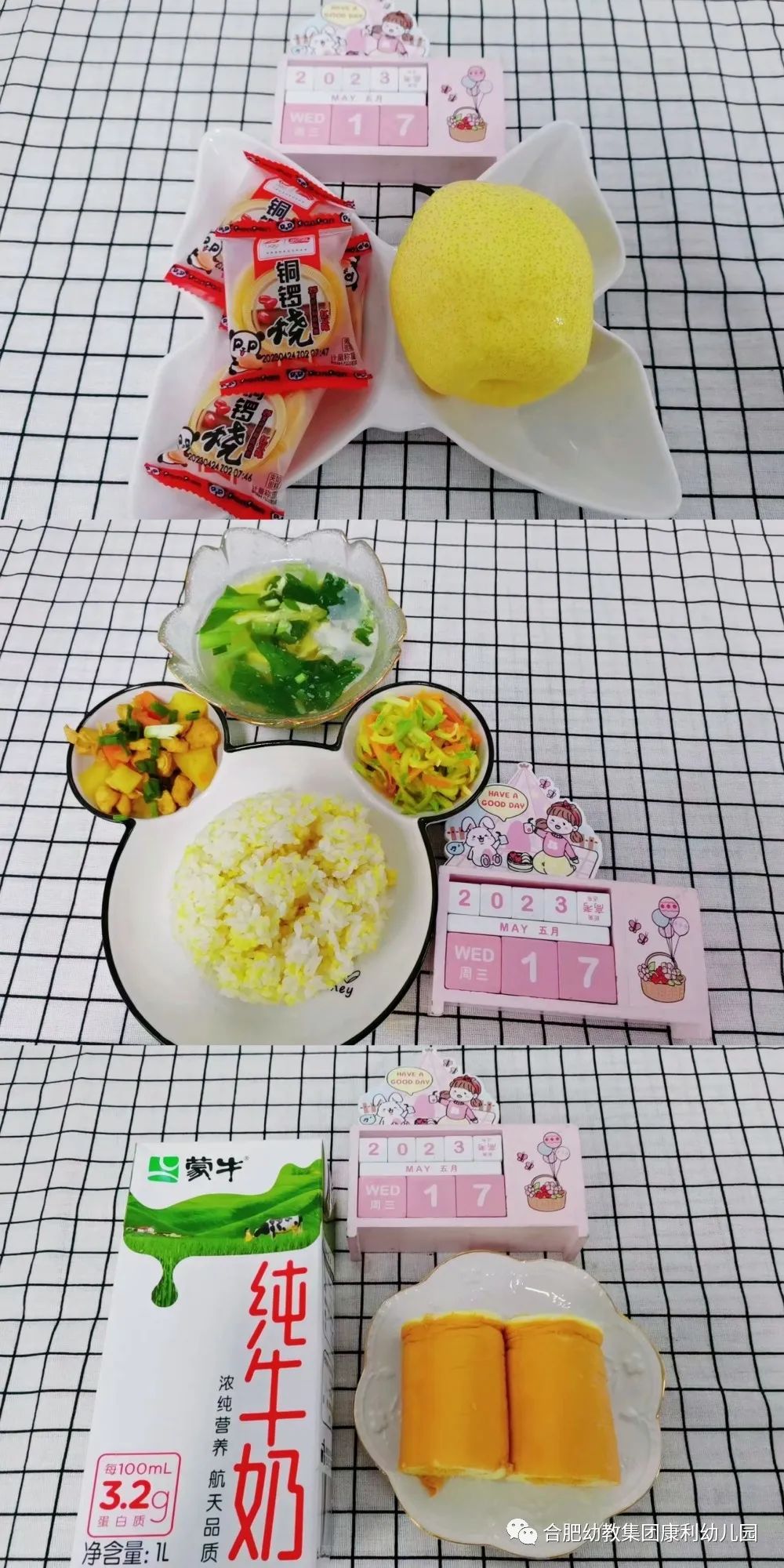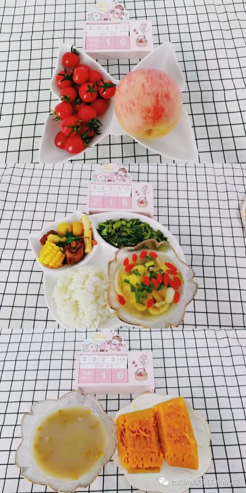 午餐:五彩菠萝炒饭(菠萝丁、火腿丁、胡萝卜丁、鲜毛豆、鸡蛋)、咕嘟咕嘟鱼头汤(海带、豆腐、白玉菇、鱼头)