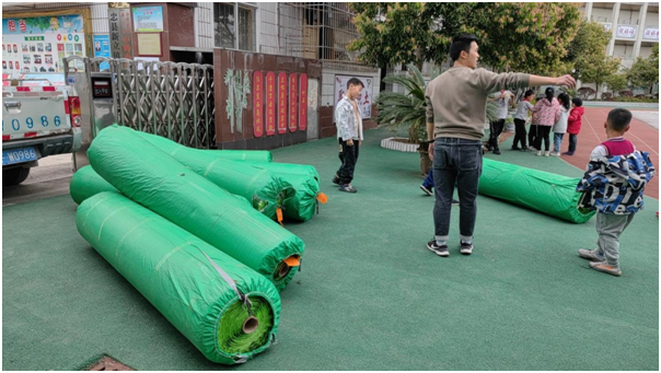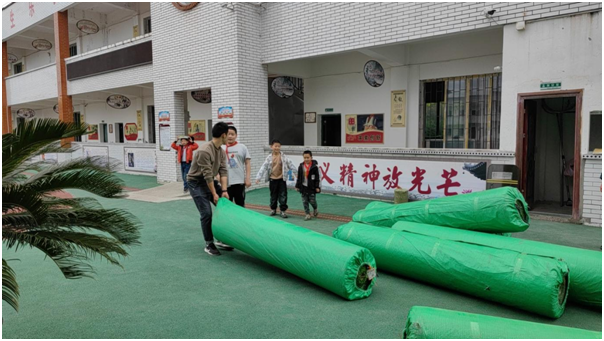2024年3月26日下午,新立商会、重庆三佳建筑劳务有限公司援建中岭小学操场草坪项目的草坪、胶水等物资运抵学校。