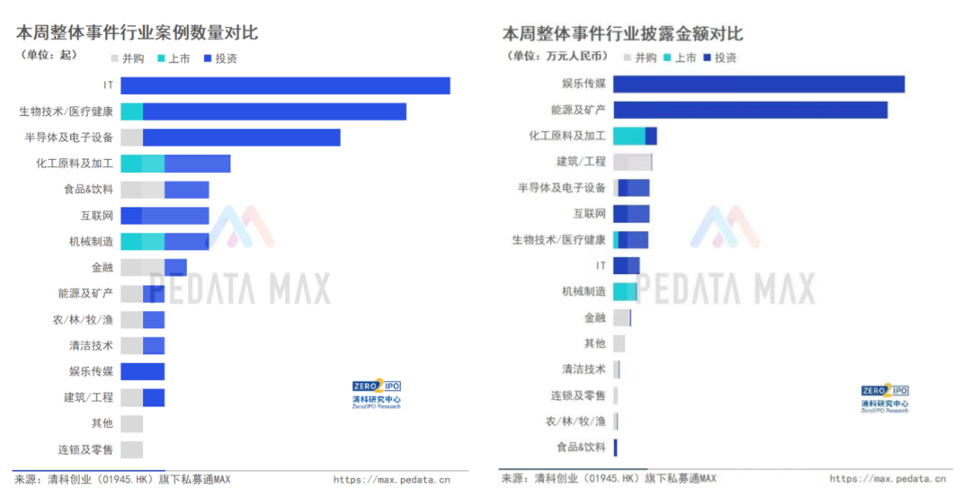 清科创业(01945.HK)旗下私募通MAX统计:截至本周五下午,投资、上市和并购共70起事件,涉及总金额371.18亿人民币。其中IT、生物医药、半导体等领域投资活跃,娱乐传媒、能源及矿产、化工原料等及加工最吸金。本周涉及金额较大的投资事件是:纽约豪华健身品牌【Equinox】完成18亿美元新一轮融资。