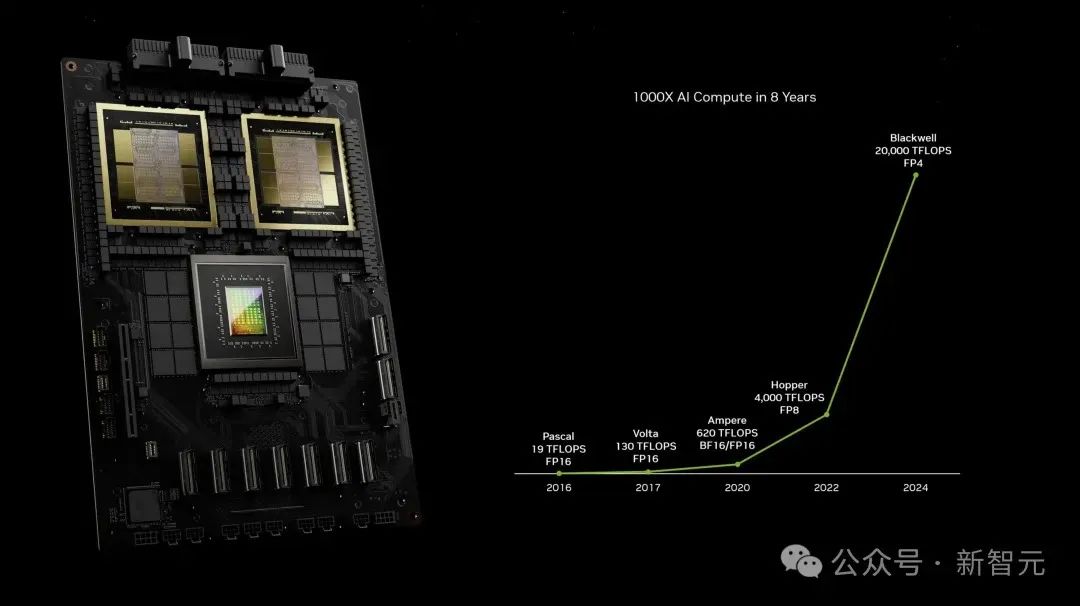 英伟达凭借H100成为全球市值第三大公司的,今年GTC人工智能大会上,再次推出了性能野兽——Blackwell B200 GPU和GB200「超级芯片」。全新B200 GPU拥有2080亿个晶体管,采用台积电4NP工艺节点,提供高达20 petaflops FP4的算力。与H100相比,直接实现了5倍性能提升,30倍推理加速,成本和能耗降低了25倍!一个GB200 NVL72机柜FP8精度的训练算力就高达720PFlops,直逼H100时代一个DGX SuperPod超级计算机集群(1000 PFlops),可以训练27万亿参数的模型,相当于能训练近15个GPT-4模型。(来源:新智元)