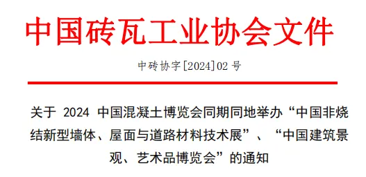 为了推动我国非烧结新型墙体、屋面与道路材料技术和中国建筑、景观、艺术的发展,进一步引导混凝土等非烧结类原材料、建筑与土木工程用混凝土、水泥制品、各类水泥基建筑材料制品生产和工程施工向非烧结新型墙体、屋面与道路材料技术建筑景观艺术的延伸高质量发展,展示行业非烧结企业及装备企业在新形势下的技术、材料、装备暨配套服务产品以及科技创新成果,特别是非烧结新型墙体、屋面与道路材料综合利废和建筑部品化、建筑工业化科技创新成果,中国砖瓦工业协会决定联合相关协会在2024 中国混凝土博览会期间,同期同地举办“中国非烧结新型墙体、屋面与道路材料技术展”、“中国建筑景观、艺术品博览会”
