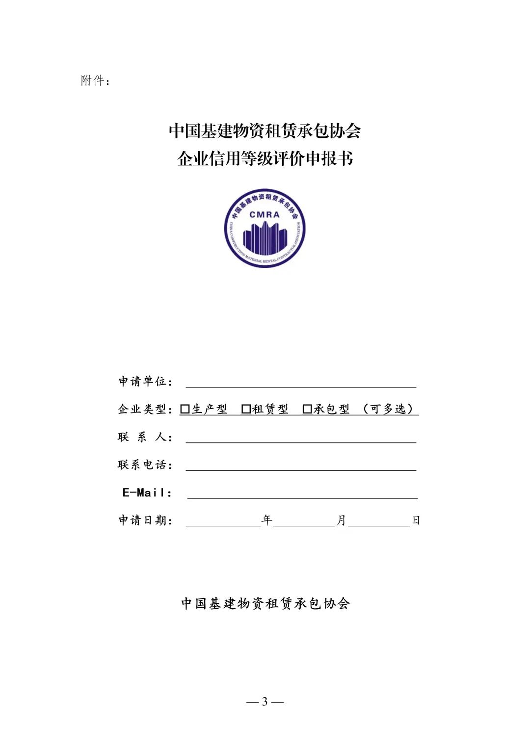 协会秘书处依照《建筑周转物资生产与租赁承包企业信用等级评价标准》(T/CMRA 19—2024)《全国建筑物资租赁承包企业信用等级评价工作实施细则》的要求,受理信用等级评价工作。希望各会员企业积极参与到信用评价工作中来,为推动我国基建物资租赁承包行业信用体系建设做出贡献。申报企业如需相关文件资料,可向秘书处索取或从“中国基建物资租赁承包协会官方网站”(www.cmra1994.org.cn)下载。如对相关事宜进行咨询,请联系协会秘书处。