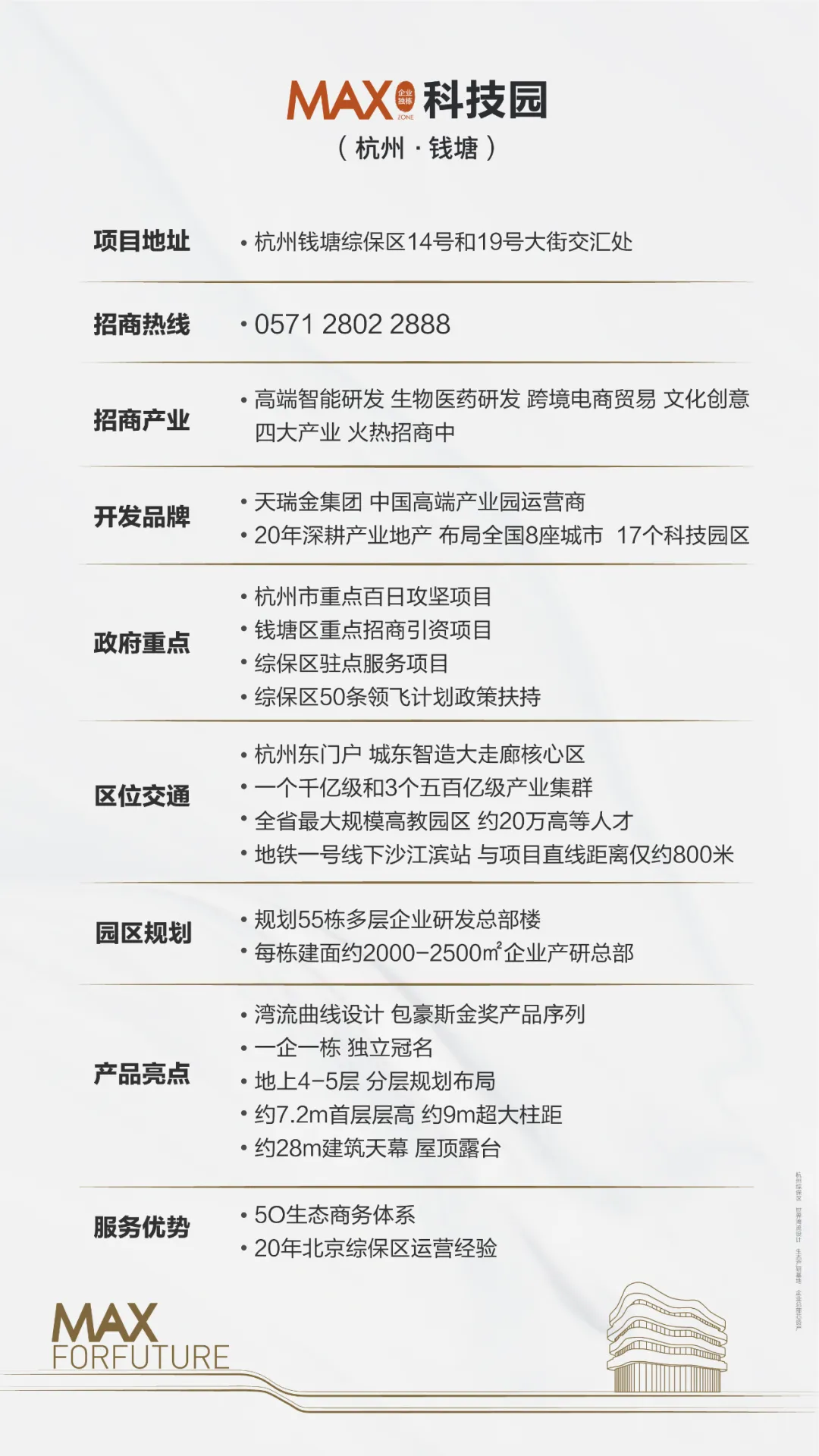 短短五年时间里,杭州综保区在多个维度实现“模式首创”、“杭州唯一”和“全国率先”。MAX科技园(杭州·钱塘)背靠综保区,做好产业链研究、聚焦产业链招商,四大招商产业“高端智能研发、跨境电商、生物医药研发、文化创意”,与综保区产业规划同频发展,为高新技术企业量身打造科技生态园区,与企业共生长,欢迎远见时代的企业家入驻!