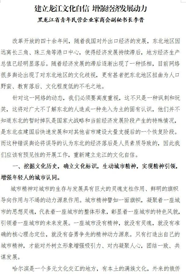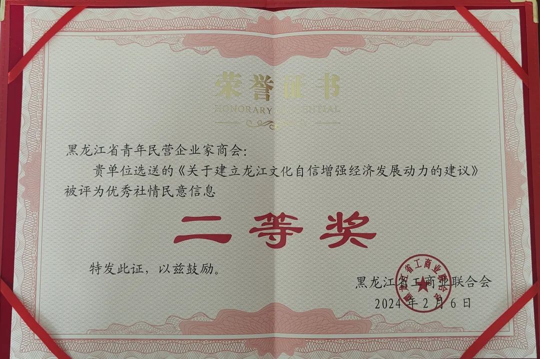 撰写的《关于建立龙江文化自信增强经济发展动力的建议》,荣获2023年全省工商联系统优秀社情民意信息二等奖。