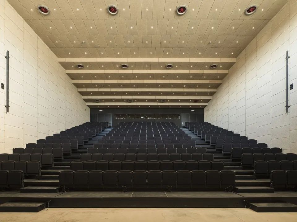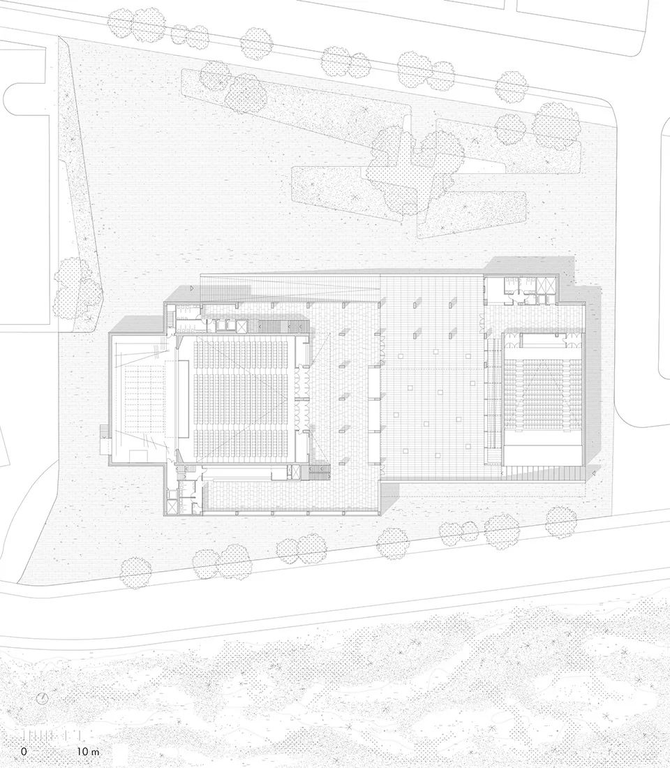 大礼堂位于两个大型混凝土声学大厅的广场的一侧,另一侧则容纳了300人和150人的礼堂,两者在下方由高台连接,高台下是化妆间、坑道、仓库和展览空间。