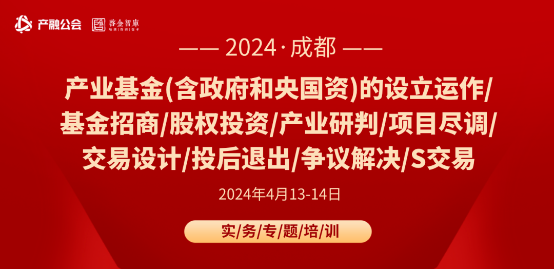 启金智库 将于 2024年4月13-14日(周六/日)在 成都 举办 《产业基金(含政府和央国资)的设立运作、基金招商、股权投资、产业研判、项目尽调、交易设计、投后退出、争议解决、S交易实操和案例专题培训》,特邀两位行业一线拥有十几年优秀实操经验的行家主讲分享,洞悉产业基金募投管退运作中的各类机遇和挑战,助您建立展业必要的知识体系、实战技能和有效人脉,诚邀您的参加!