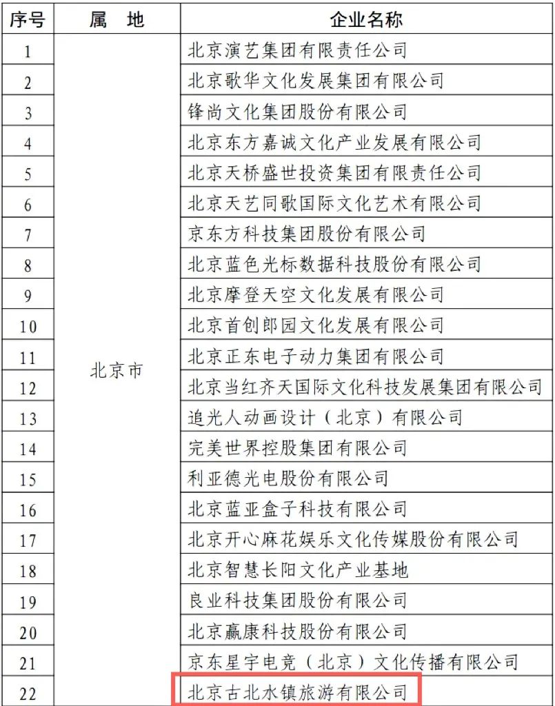 3月26日,文化和旅游部公布了新一批国家文化产业示范基地名单,北京古北水镇旅游有限公司成功入围新一批国家文化产业示范基地名单。
