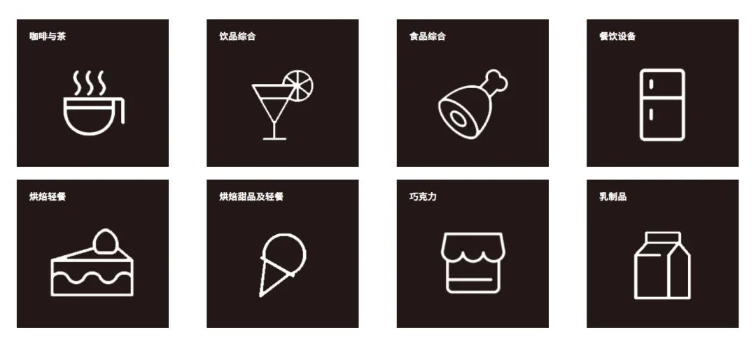 咖啡与茶:咖啡设备及配件、咖啡冲泡设备及配件、咖啡原料及相关用品、茶原料及成品、茶具及工艺品(玻璃制品、陶瓷制品、茶具、茶具及工艺品)、茶设备与技术(茶叶提取机、茶叶烘干机、茶叶包装机等)