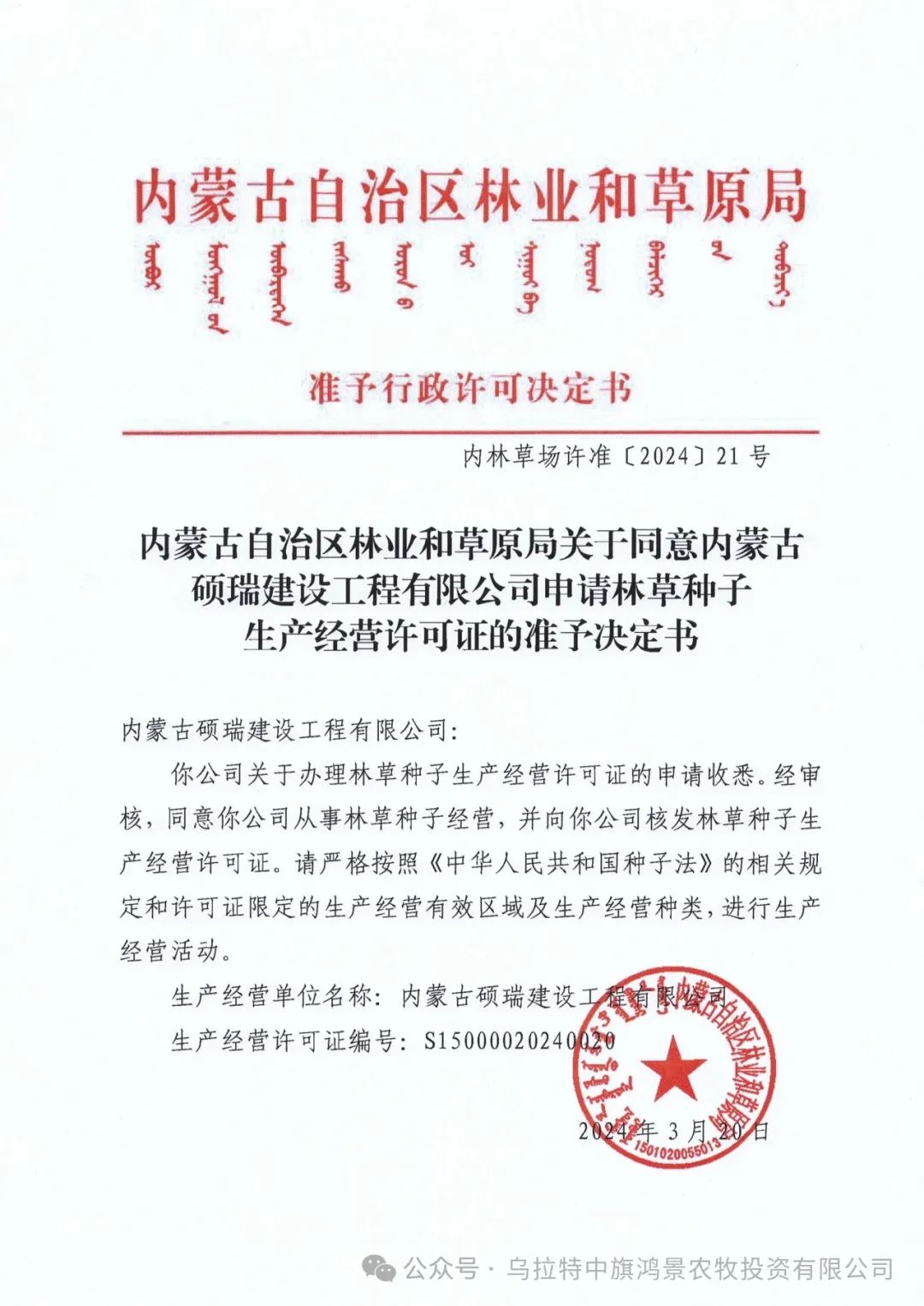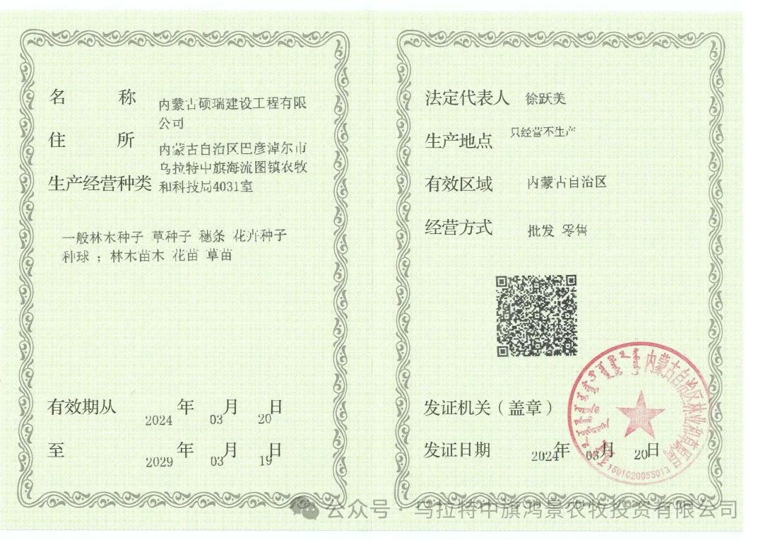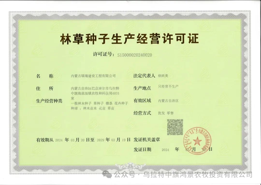 3月20日,乌拉特中旗鸿景农牧投资有限公司全资子公司---内蒙古硕瑞建设工程有限公司林草种子生产经营许可证经过层层审批,已申报成功,为我公司在草原生态综合治理、生态保护和修复、草原植被恢复、生物多样性保护等业务的承接提供了敲门砖。