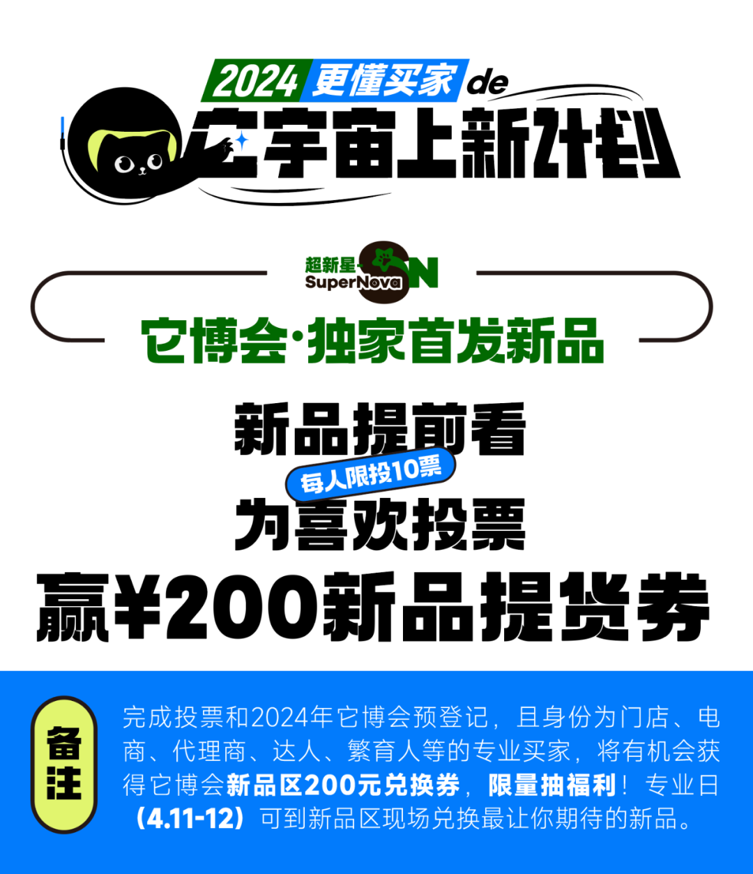为了回馈一直支持它博会的各位专业观众。现在进入它博会新品超级番小程序并为心目中的10大年度新品投票,还将有机会获得价值200元的它博会新品提货券。可在专业日期间(4.11日-12日)到它博会新品区现场兑换最让你期待的新品。