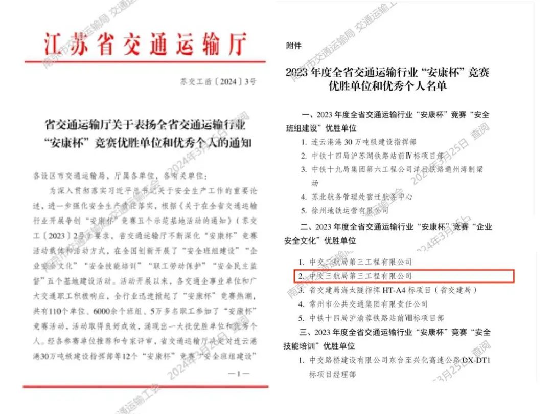 3月21日,江苏省交通运输厅发布《关于表扬全省交通运输行业“安康杯”竞赛优胜单位和优秀个人的通知》,公司荣获全省交通运输行业“安康杯”竞赛“企业安全文化”优胜单位。