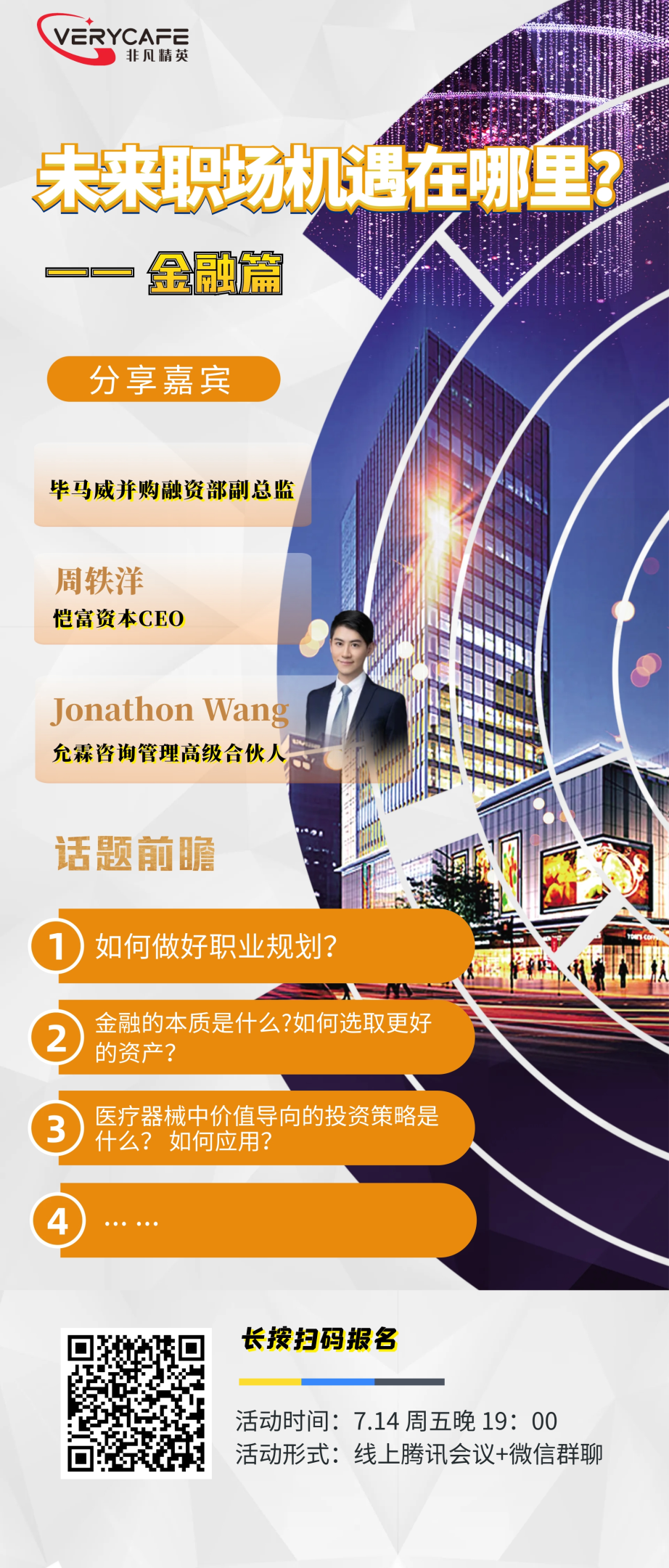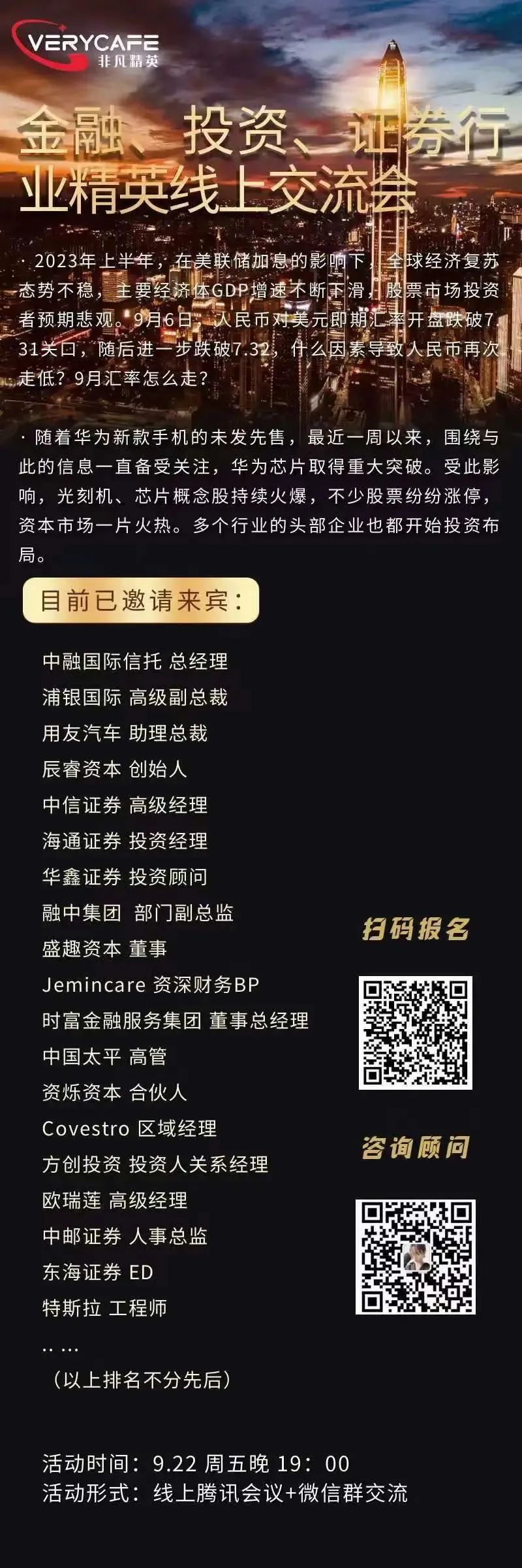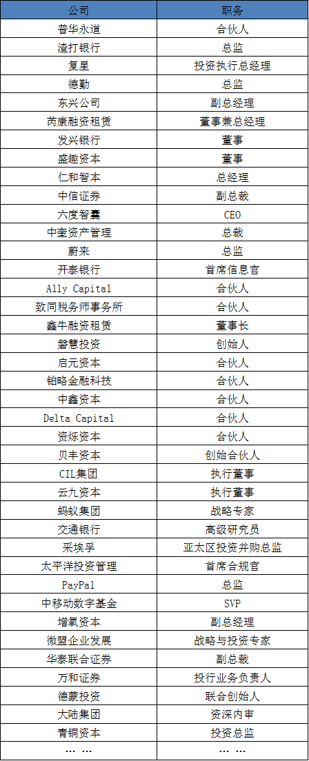 至少5年以上金融行业从业经验;证券、银行、投资、会计师事务所等知名企业为主;金融行业的企业主、中高层管理、投资人,专业人士,专家学者等。