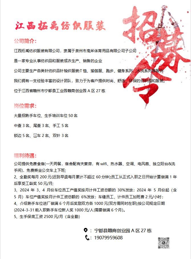 江西拓禹纺织服装有限公司 诚聘