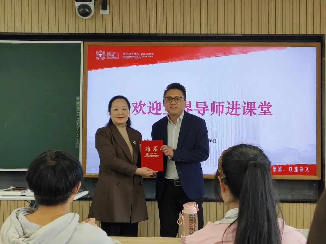 国际文化旅游学院党委副书记、副院长、纪委书记韩振华对蔡总亲临课堂教学表示欢迎,并向其颁发浙大城市学院旅游管理专业业界导师聘书。