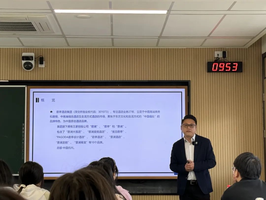 3月26日上午,国际文化旅游学院有幸邀请到浙江君亭酒店集团人力资源总监蔡明亲临课堂,为旅游管理专业的同学们带来精彩讲座。本次讲座聚焦于君亭酒店集团的发展历程、发展愿景、品牌介绍等方面,深入剖析在当前数字化、智能化的浪潮下,不同酒店品牌的独特营销策略。