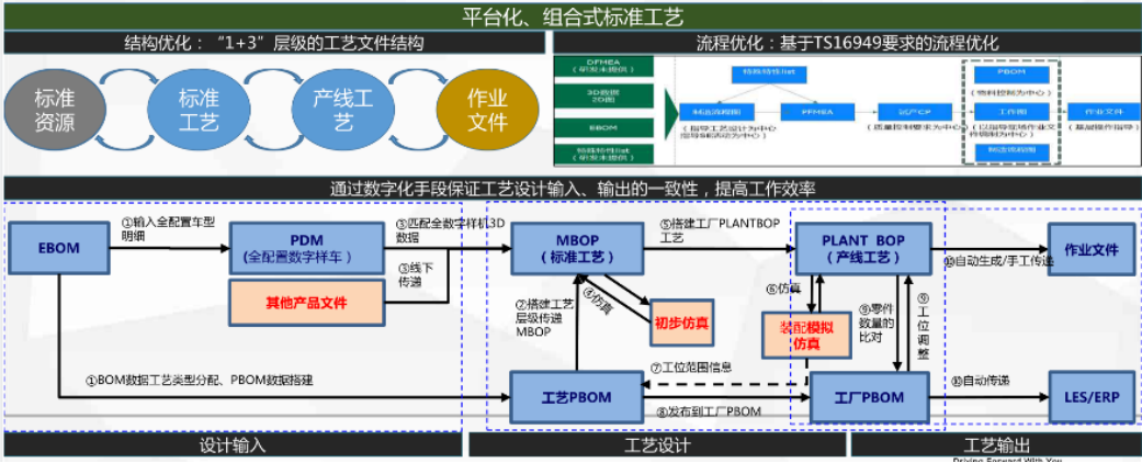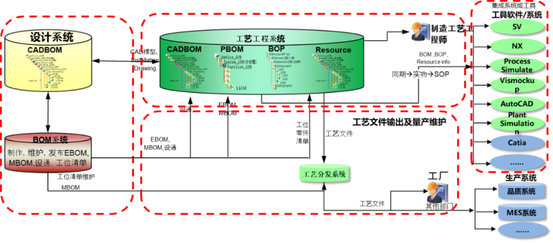 从概念设计开始,车型数据、EBOM等从研发系统集成发出,进入工艺工程系统。在工艺工程系统中,车型数据结合工厂资源、工艺标准、工位信息等形成工程工艺树。各工艺工程根据工艺树对产品的制造过程进行确认及工艺设计,对不符合项进行整改。最终面向工厂输出各工艺文件(含工艺参数)以指导产品生产及品质管控。