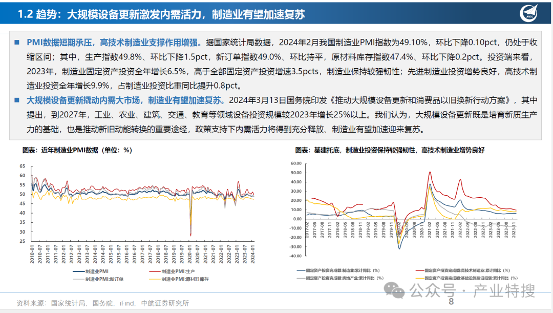 - 大规模设备更新政策刺激下,内需有望修复,传统制造业加速向高端智能化转型。
