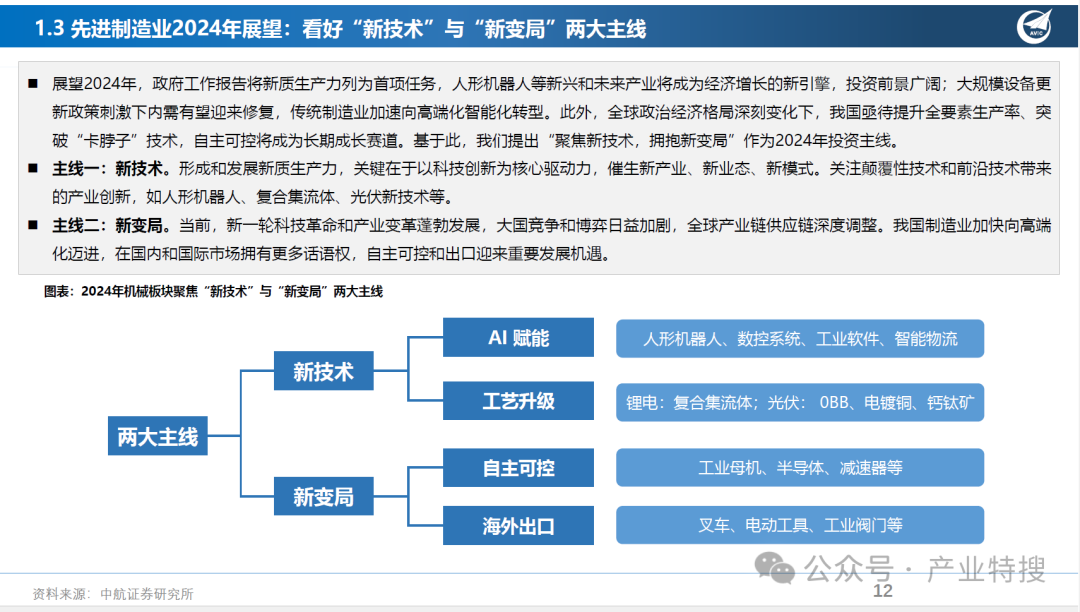 报告强调了科技创新在推动新质生产力发展中的核心作用,特别是在AI、人形机器人、专用设备新技术等方面的应用和发展前景。同时,报告也指出了全球政治经济格局的变化对我国制造业的影响,以及自主可控技术在保障产业链供应链安全稳定中的重要性。此外,报告还提供了对2024年机械行业投资策略的建议和风险提示。