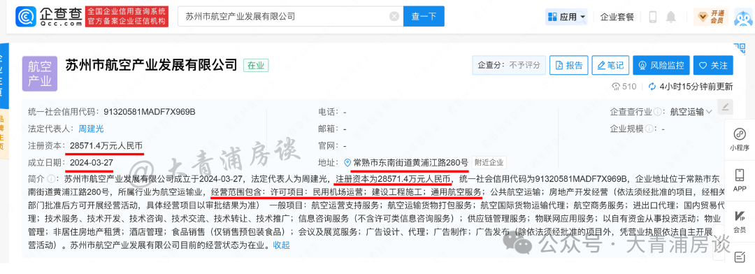 我们查阅企查查显示,苏州市航空产业发展有限公司成立日期为今天,即2024-03-27。注册资金为28571.4万元人民币,公司注册地址为常熟市东南街道黄浦江路280号。